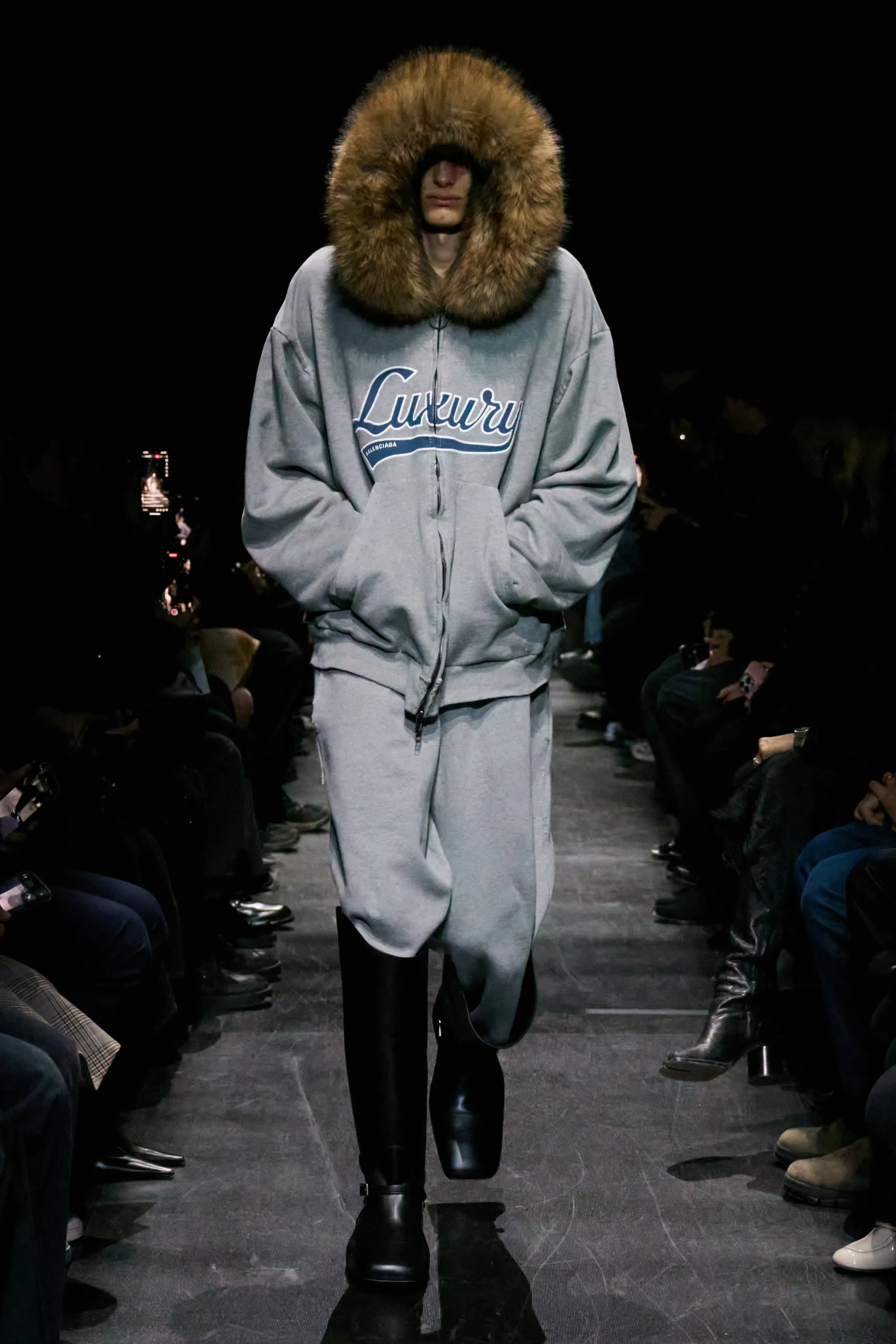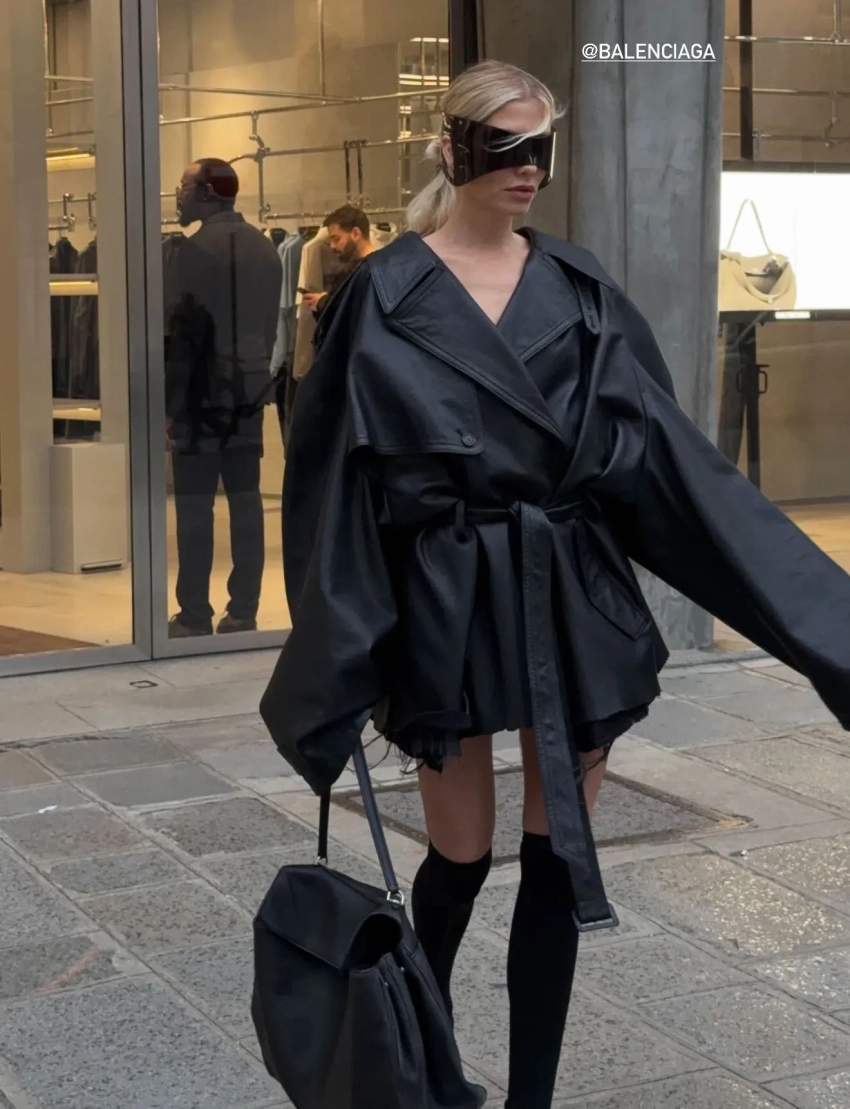 Тайра Бэнкс/Фото: Arnold Jerocki/Getty Images for BalenciagaВ новой коллекции Balenciaga представил 80 луков в узнаваемой эстетике бренда, но Демна Гвасалия максимально сократил количество оверсайз-образов на фоне вернувшегося тренда на худобу и популярности "Оземпика" среди звёзд. Осенью дизайнер предлагает носить в основном облегающие вещи: офискор-образы с блузой с корсетом и юбкой-карандашом, жакеты и пальто приталенного силуэта, длинные шубы с босоножками, кожаные плащи, вещи из 2010-х: пуховики с ремнём на талии, короткие куртки с капюшоном с мехом и джинсовки, а также олимпийки с лаковыми ботфортами, вечерние платья в горошек, ажурные колготки и очки-маски.