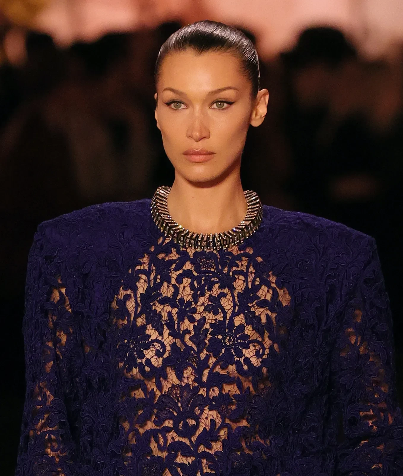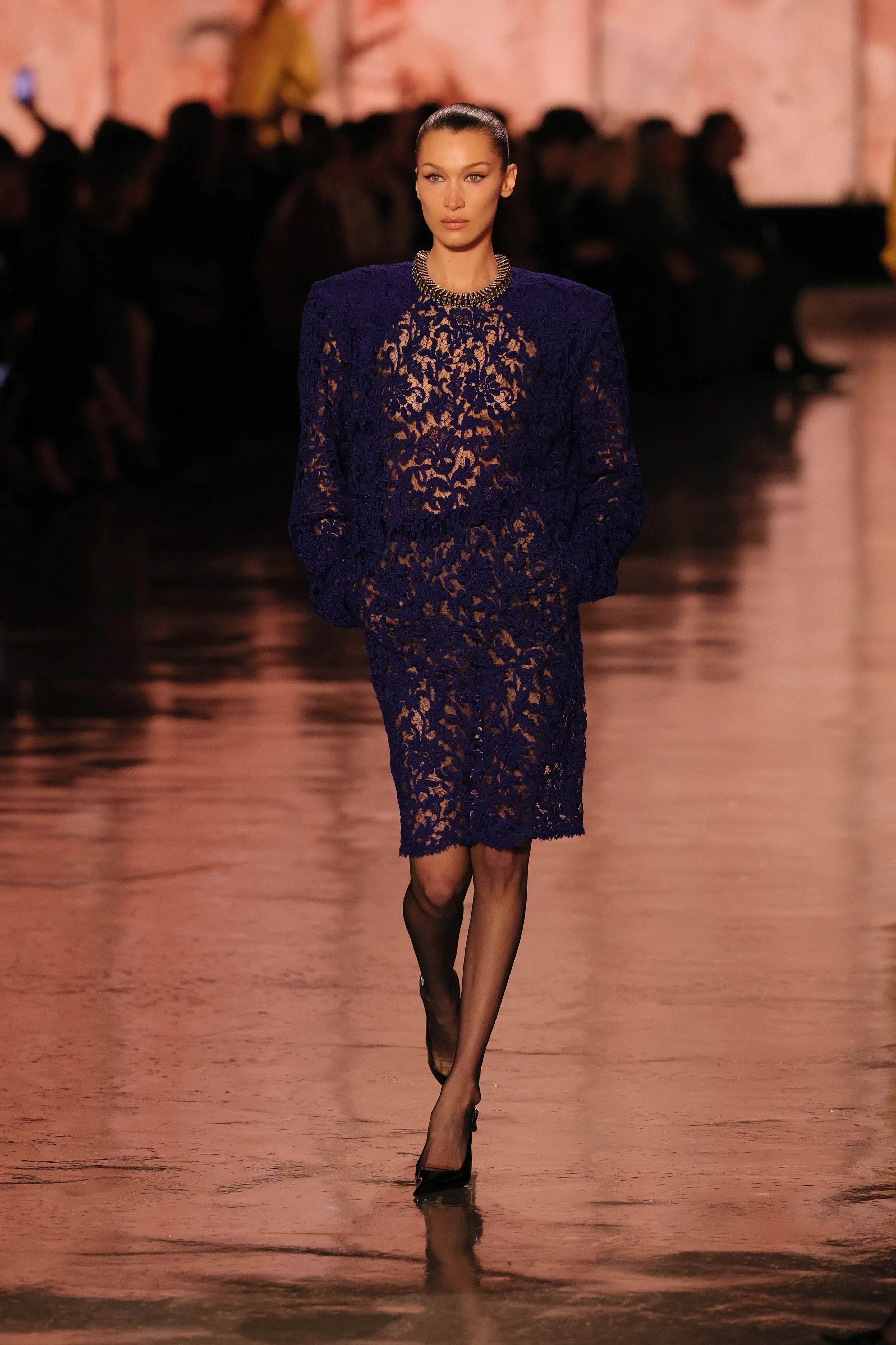Белла Хадид приняла участие в показе Saint Laurent, который стал заключительным на Неделе моды в Париже. 28-летняя супермодель и амбассадор модного дома прошлась по подиуму в тёмно-синем кружевном платье.