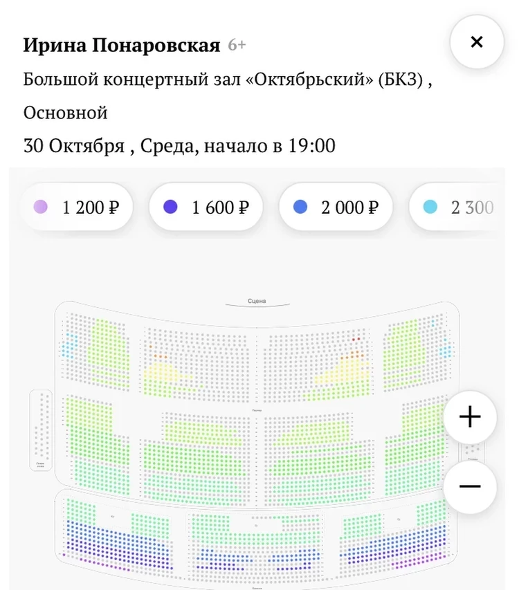 Старая схема продаж билетов на концерт Понаровской 30 октября, который был отменен. Данные продаж на 28.09 — непроданные места выделены цветным. Фото: скрин с сайта продаж.