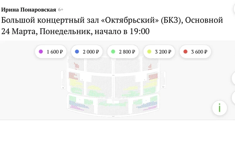 Новая схема продаж билетов на концерт Понаровской 24 марта. Цветным отмечены не проданные места на 17 марта. Фото: скрин с сайта продаж
