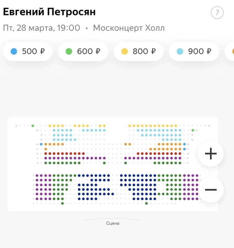Схема продаж билетов на концерт Евгения Вагановича Петросяна 28 марта. По данным на 17 марта. Цветным отмечены не проданные места. Фото: скрин с сайта продаж