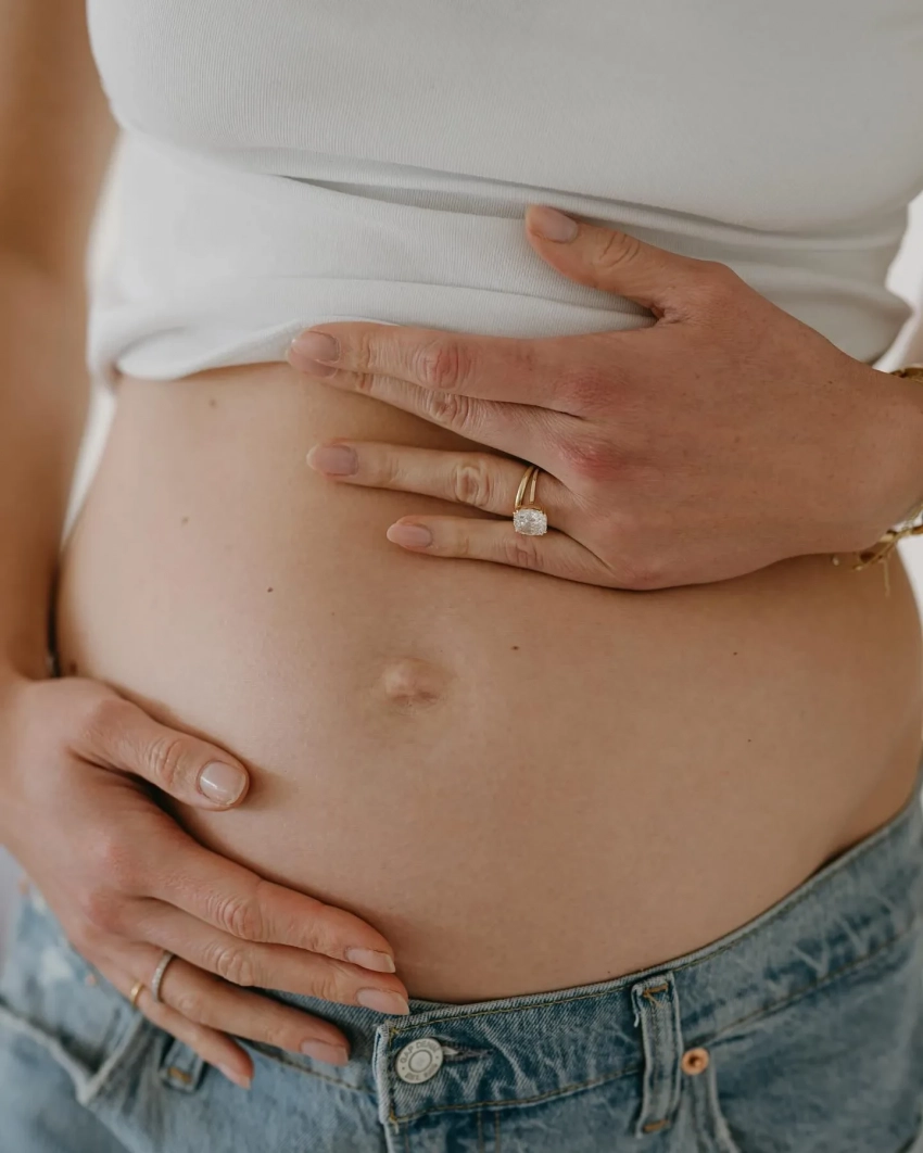 На снимках Клосс демонстрирует округлившийся живот, позируя в облегающем чёрном платье с длинными рукавами и белой футболке, которую она задрала, чтобы подчеркнуть свой новый статус. Помимо этого, она добавила кадр, на котором её сыновья Леви и Элайджа обнимают друг друга. "Трое — это уже вечеринка", — подписала Карли публикацию.