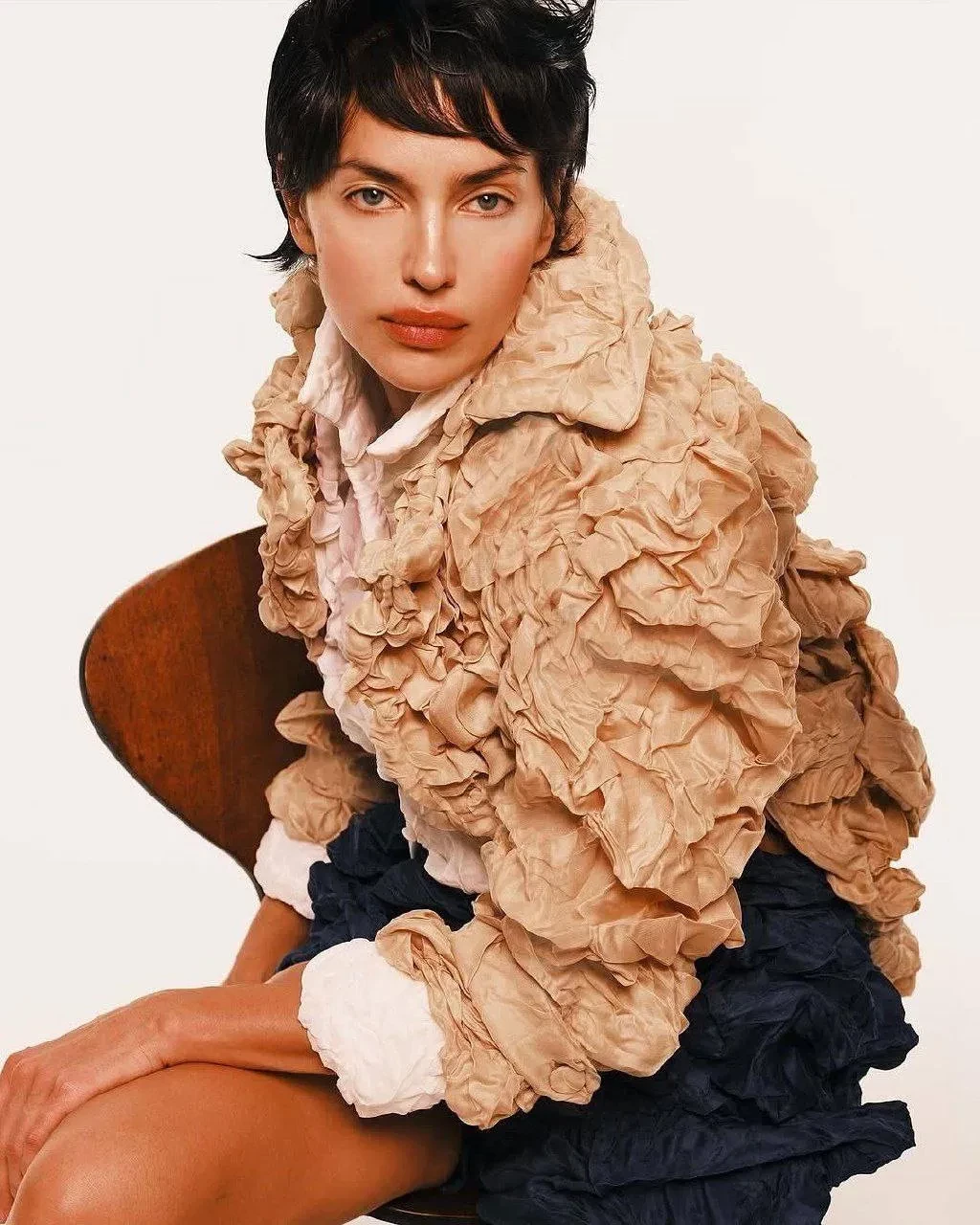 Ирина Шейк стала героиней нового выпуска китайской версии журнала Dust. 39-летняя российская модель украсила две обложки издания и снялась в фотосессии. На фото Ирина позирует с короткой стрижкой в платье с декольте, юбке-баллоне Alaia, зелёном платье с бахромой и "мятом" жакете.