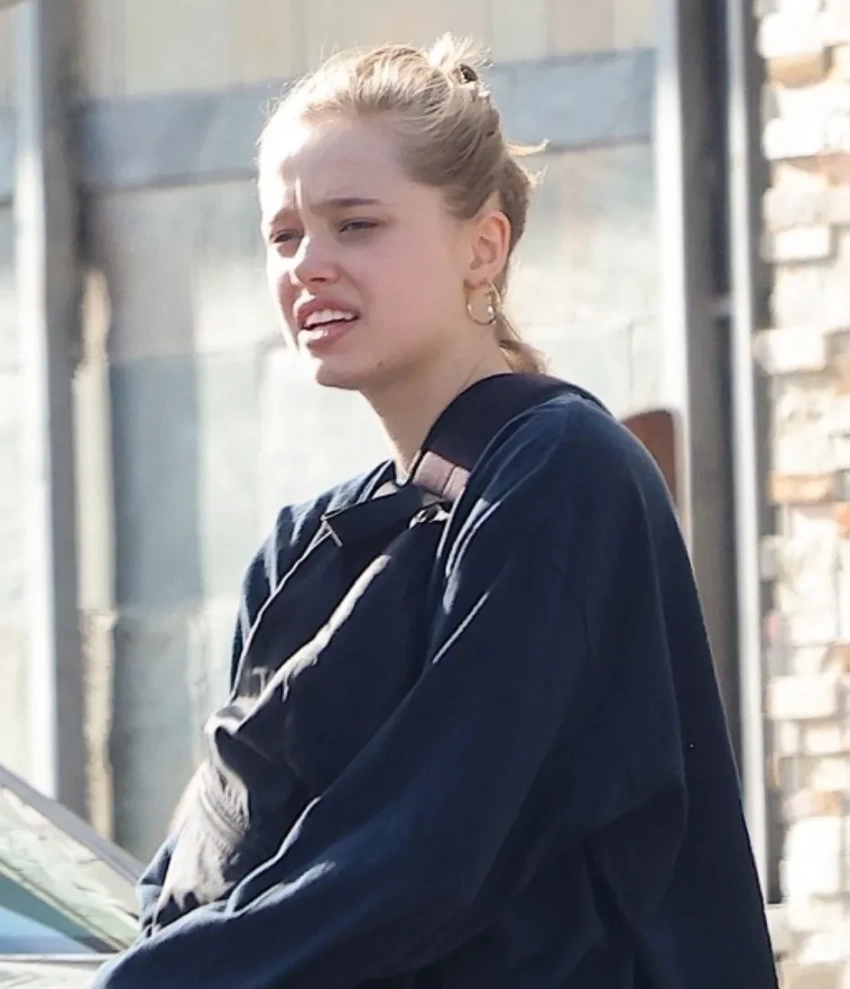 Шайло была облачена в объёмный темно-синий свитшот и широкие чёрные брюки, свои светлые волосы она убрала в высокий пучок (напомним, некоторое время Шайло носила короткую стрижку). Из аксессуаров у дочери Джоли замечены золотое кольцо на большом пальце и крупные серьги-кольца.