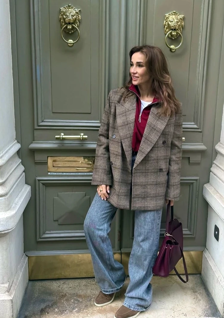 Отметила кэжуал-лук Анфисы, который она выгуливала в Италии. Объемный жакет в клетку звезда скомбинировала с бордовым свитшотом на молнии и белой футболкой, собрав актуальный многослойный образ. Дополнила ансамбль широкими джинсами и замшевыми лоферами (предположу, что Loro Piana), а также подобрала сумку в тон свитшоту. Получился приятный для глаз по цветовой гамме лук.