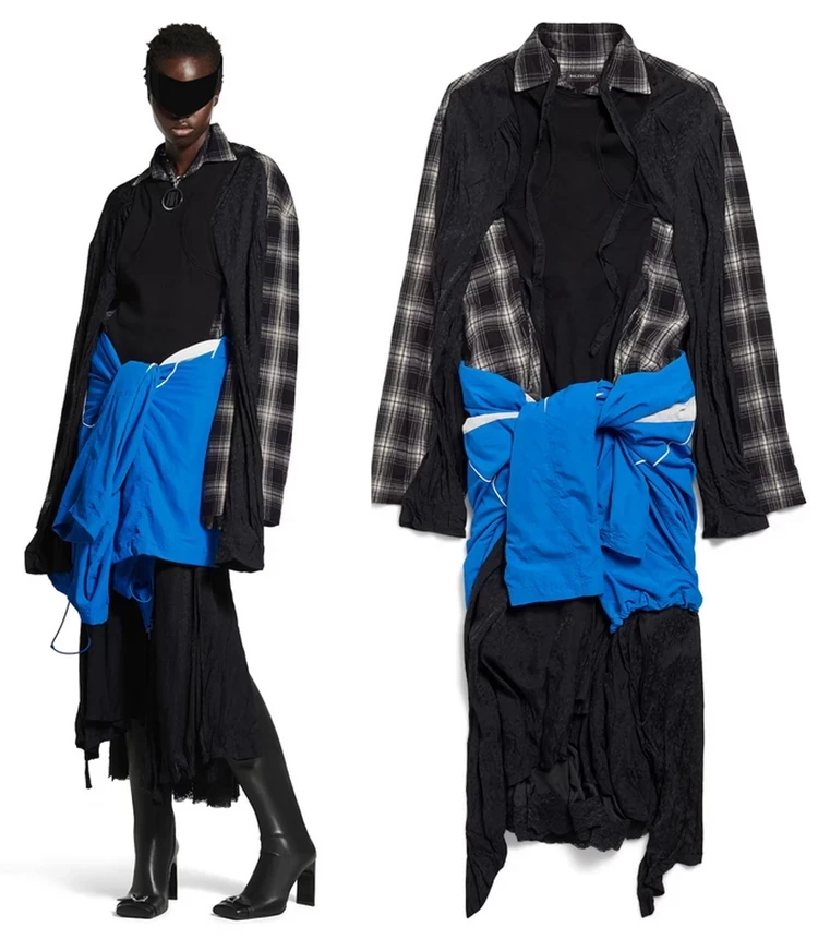 В рамках летней коллекции Balenciaga Демна Гвасалия предлагает нарядиться в оригинальное «сложносочиненное» платье. На самом, деле, наряд напоминает кучу тряпок, которые соединили между собой. Цена творения — 705 000 рублей. Если душит жаба, то можно отыскать старую олимпийку и скрестить ее с рубашкой в клетку и каким-нибудь платьем. Эффект будет тот же.