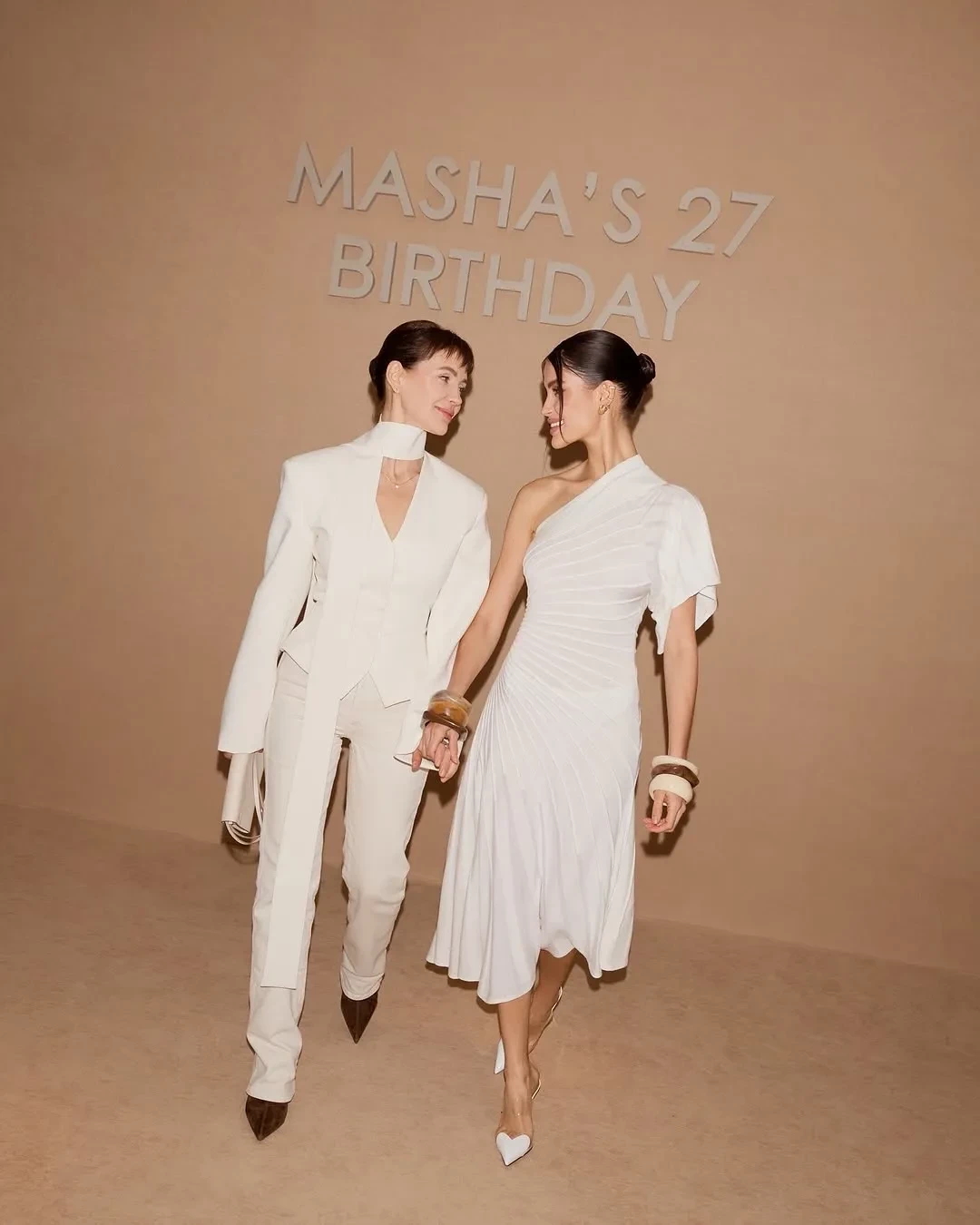 Судя по снимкам, дресс-кодом вечеринки стали чёрный и белый цвета. Мария появилась перед гостями в белом платье Alaia на одно плечо и дополнила образ массивными браслетами. Поздравить Лобанову пришла её мать Евгения и сестра Екатерина, а также основательница Дома красоты Bemônt Варвара Мазараки, визажист Валентина Гросс, модель Анастасия Бова и другие.