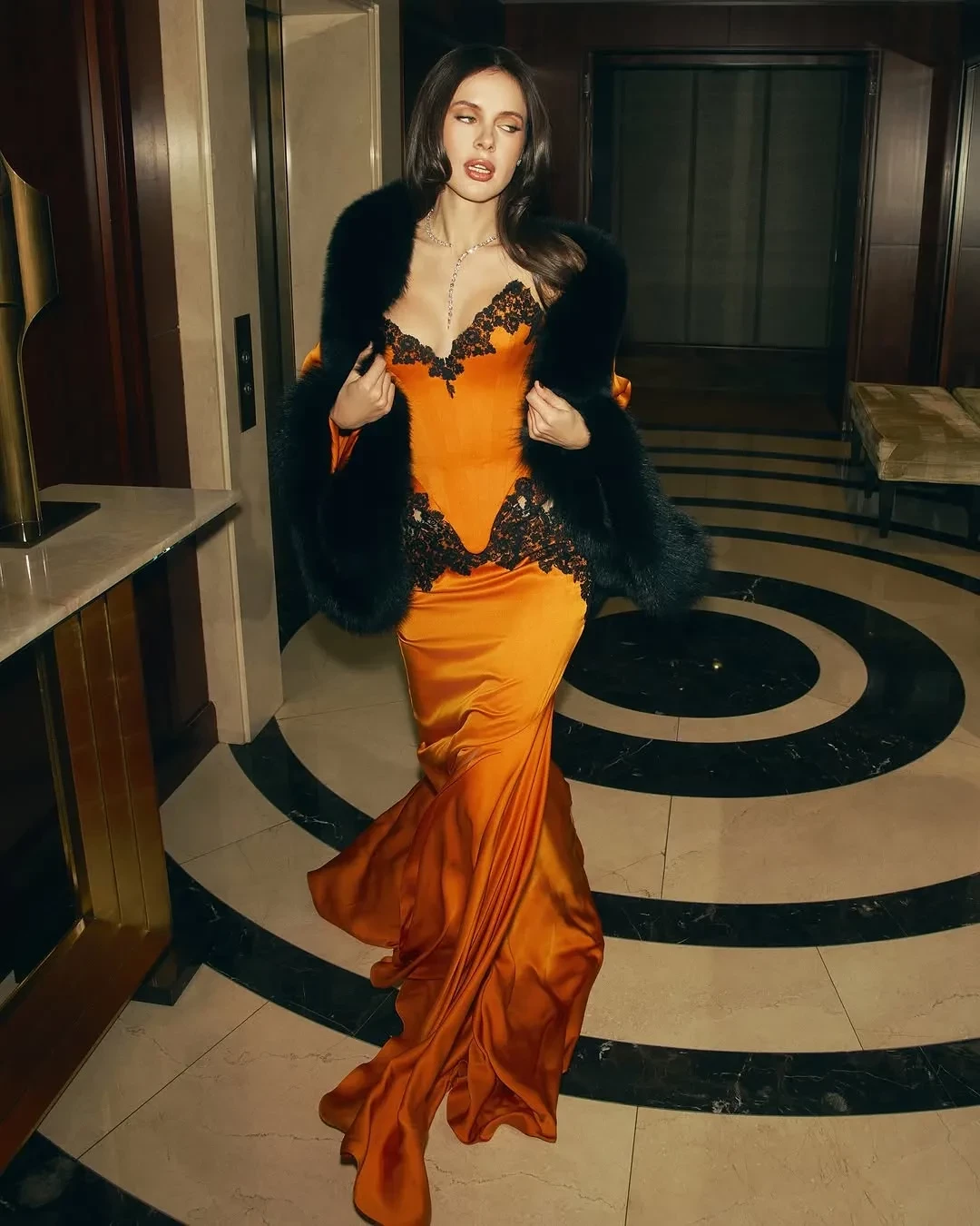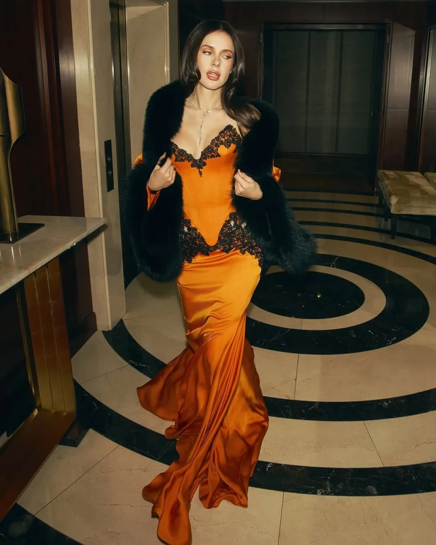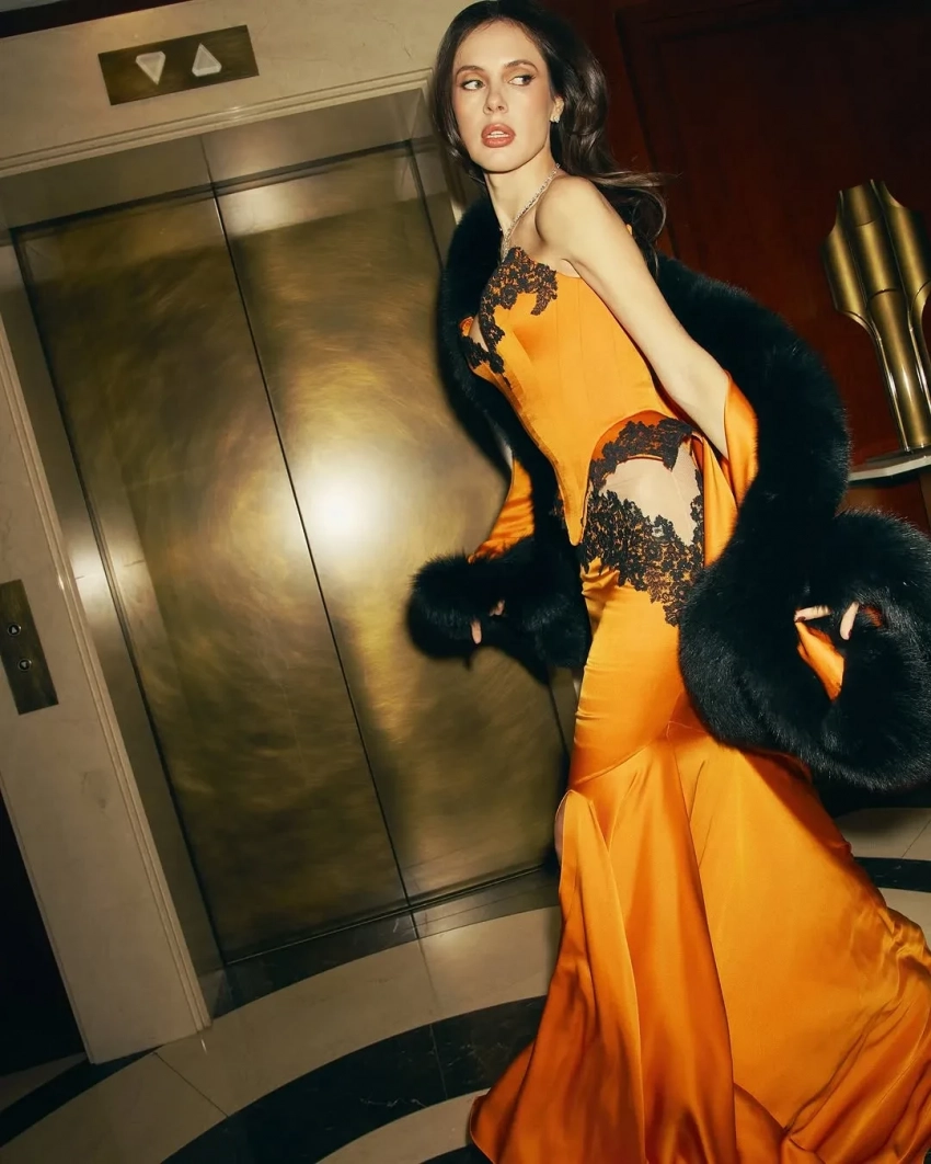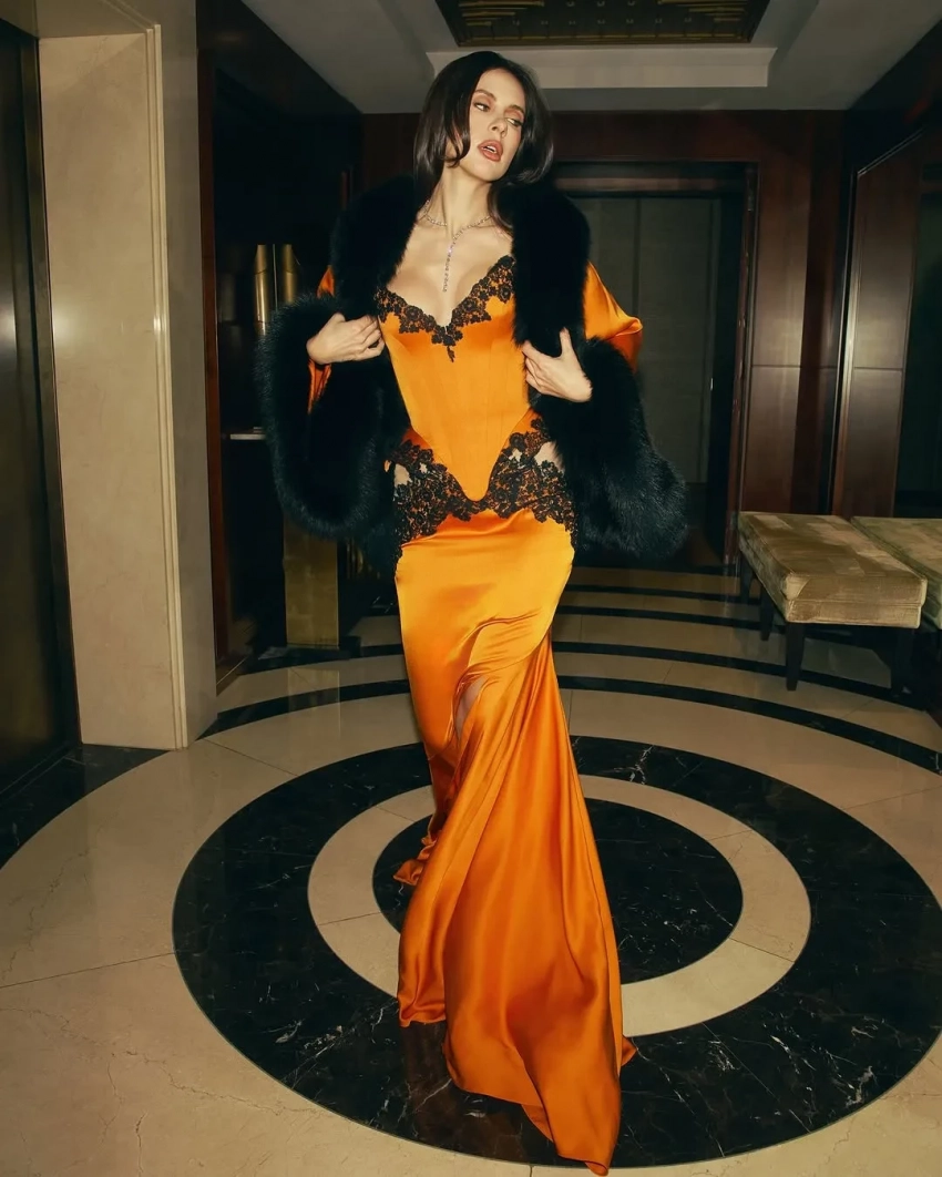 34-летняя блогер и бизнесвумен появилась в оранжевом корсете и юбке со вставками из чёрного кружева из новой демикутюрной коллекции Belik. Образ, который подобрала для Шипиловой её стилист Ксения Смо, дополнили меховое манто и колье с бриллиантами Shiphra.