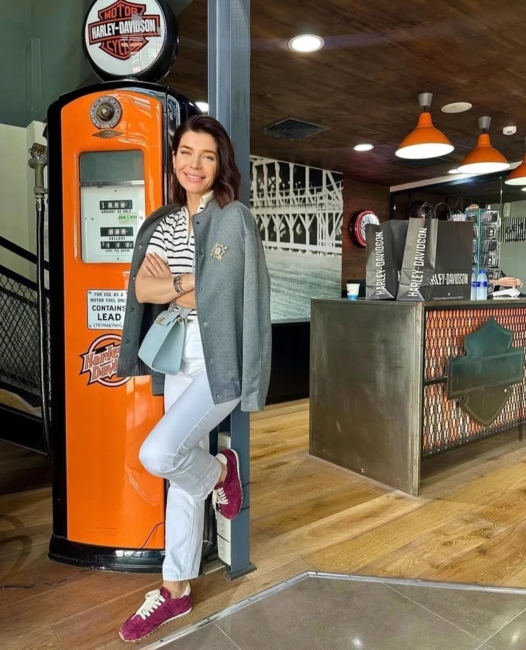 Актриса использует в своем образе отдельные элементы теннисного стиля — а именно полосатое поло и замшевые кроссовки. Их она вписывает в повседневный лук с белыми джинсами и бомбером. Дополняет образ голубой сумкой.