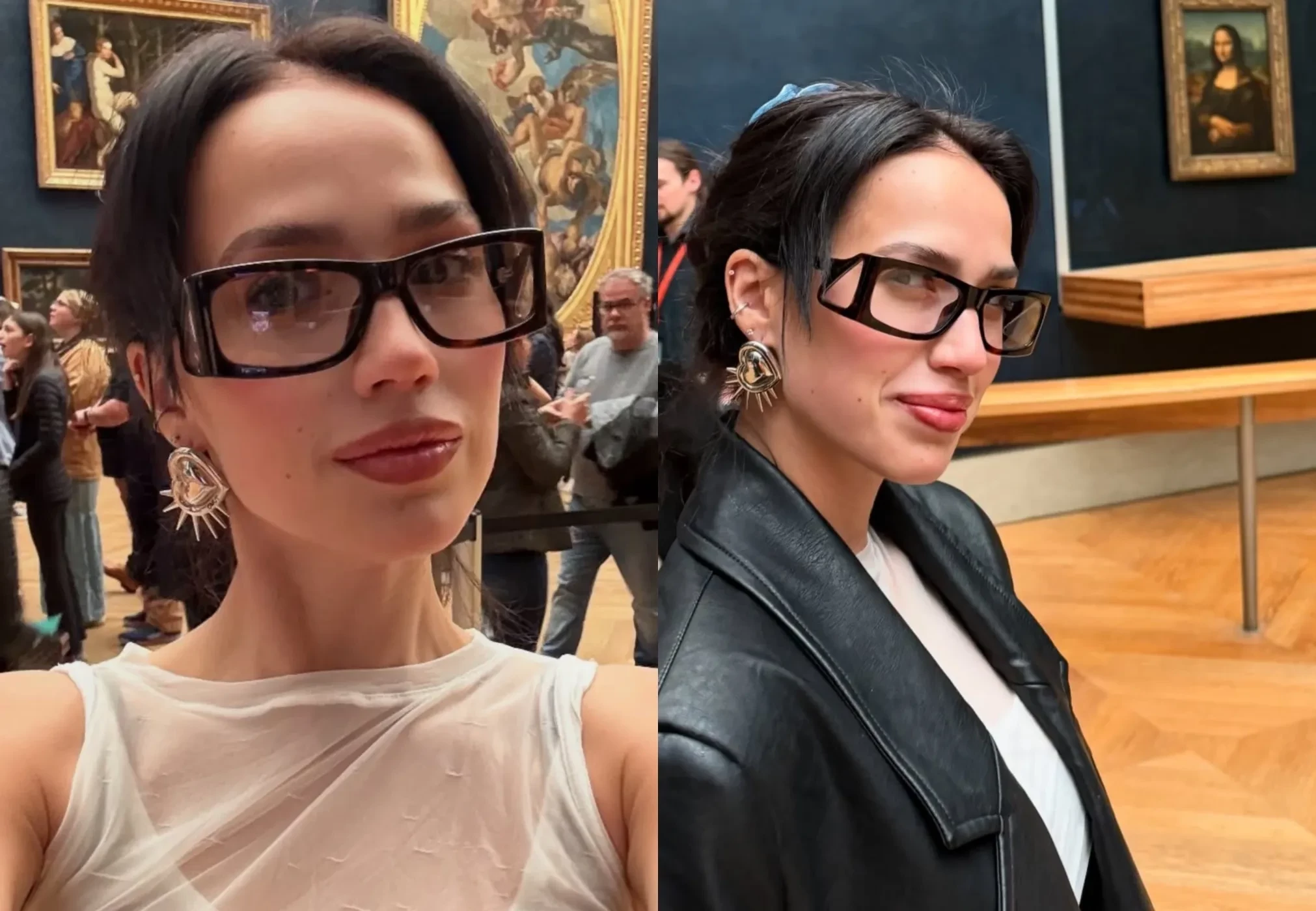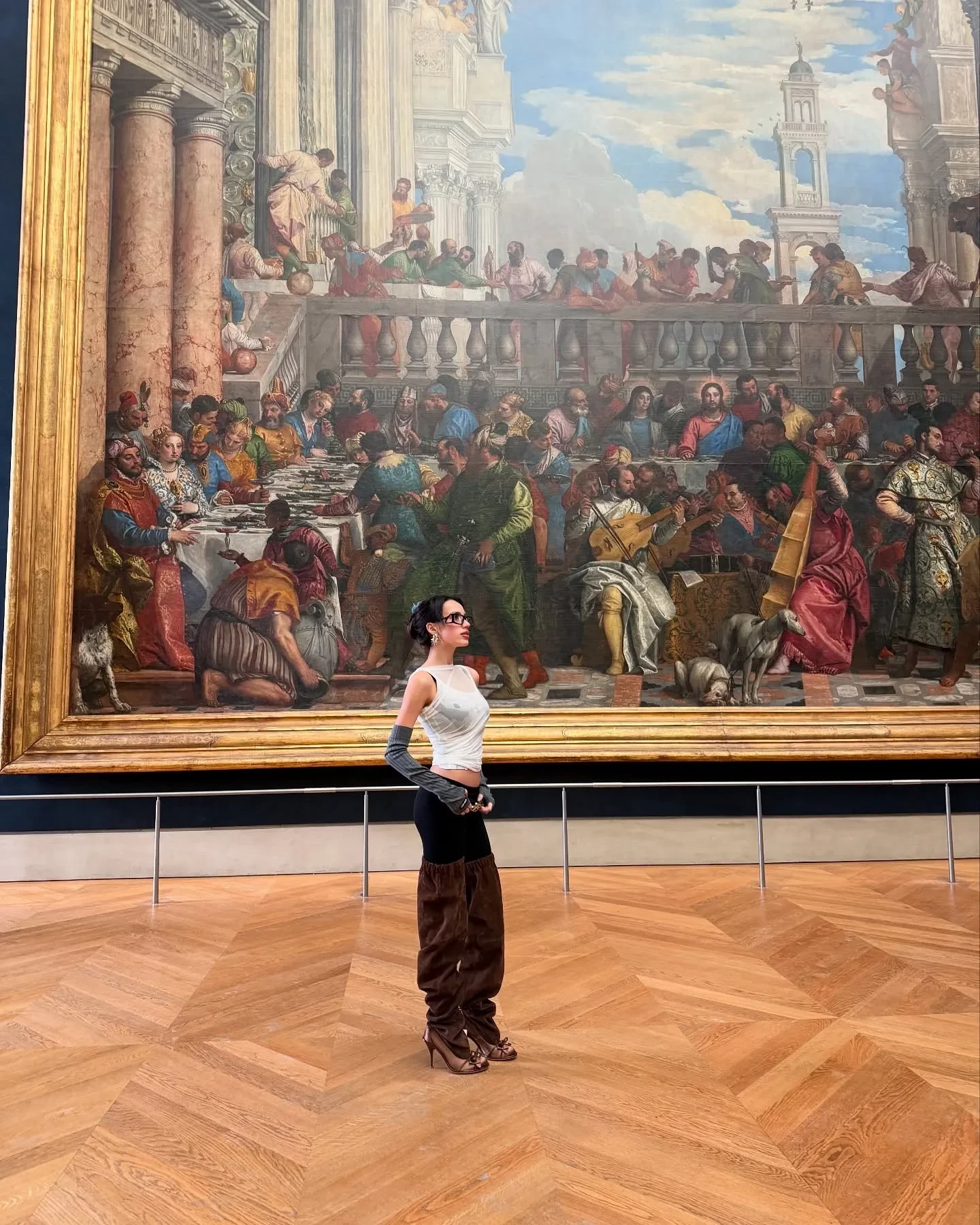 На фото Загитова позирует на фоне знаменитого полотна Паоло Веронезе "Брак в Кане Галилейской", а также рядом с картиной Леонардо да Винчи "Мона Лиза", где попыталась воспроизвести знаменитую улыбку "Джоконды". Для посещения музея спортсменка выбрала полупрозрачную майку, трендовые коричневые ботфорты и очки в толстой оправе.