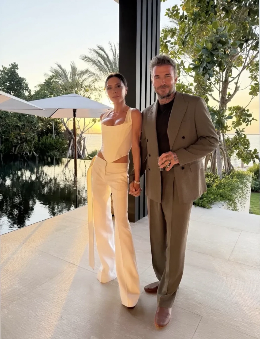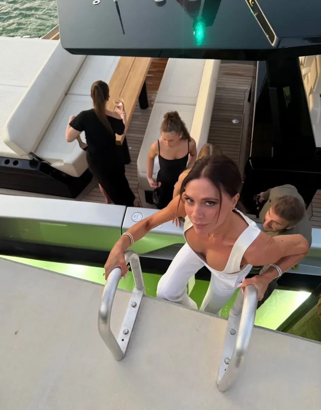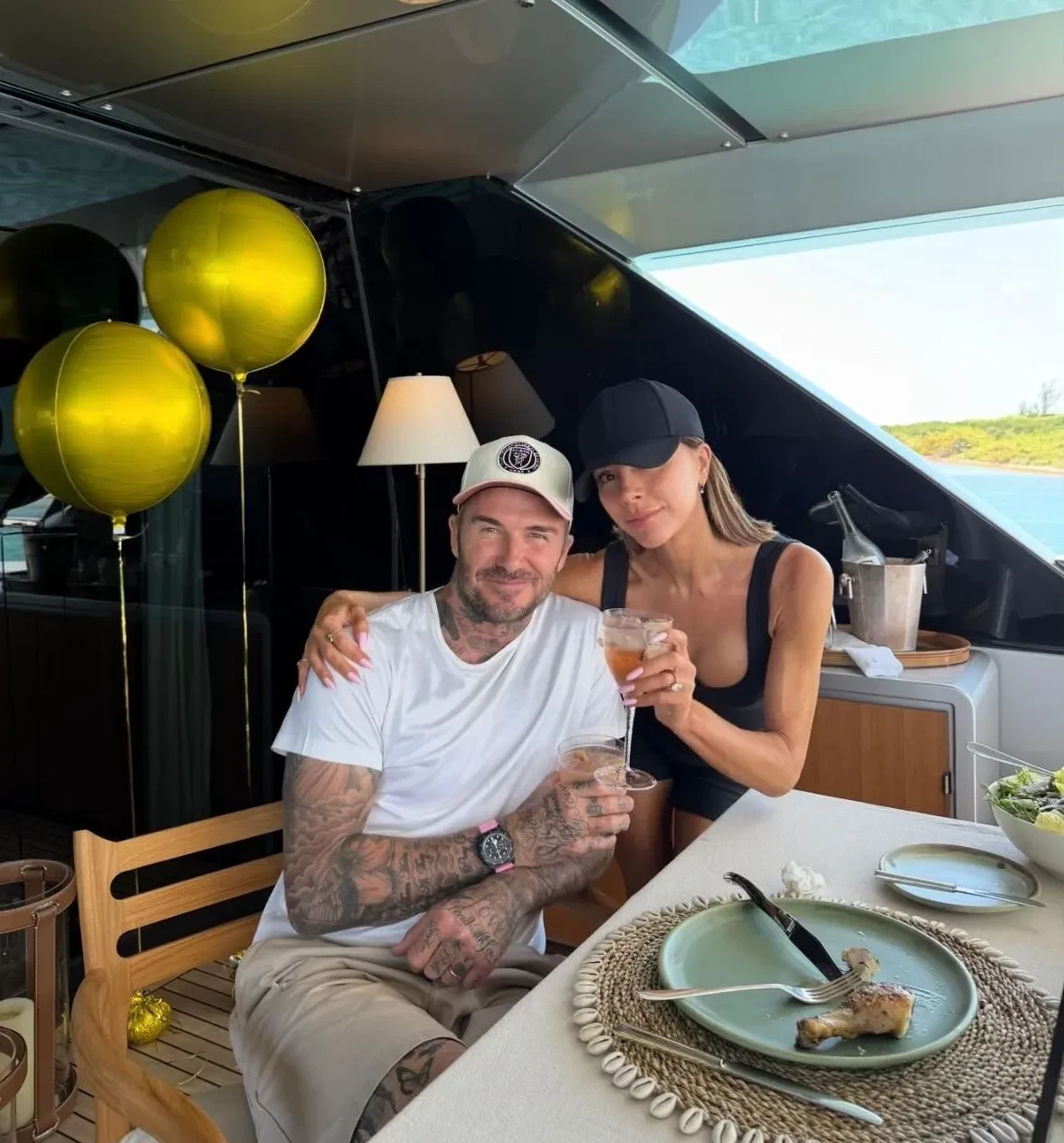Сначала семья в узком кругу отметила праздник на яхте, предположительно, в Майами, где Виктория задула свечу на небольшом торте. Ближе к вечеру Бекхэмы переместились на вечеринку, где собрались близкие друзья, а Виктория появилась перед гостями в белых брюках и корсете: в этом образе её невестка Никола Пельтц выходила на премьеру своего фильма "Лола"в прошлом году.