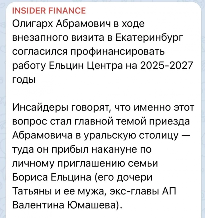 Инсайдеры утверждают, что именно ради этого Абрамович приехал в уральскую столицу: "Он прибыл по личному приглашению семьи Бориса Ельцина".