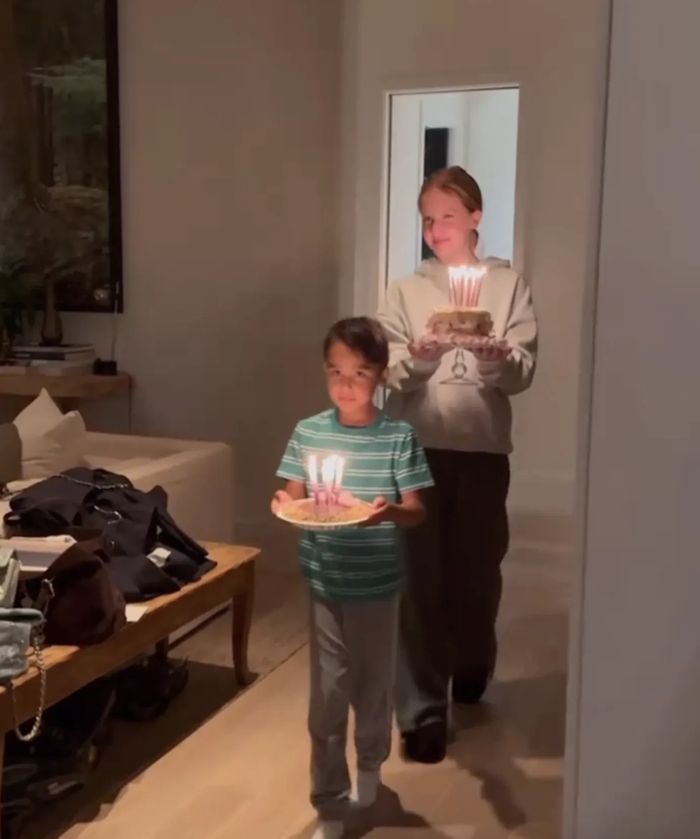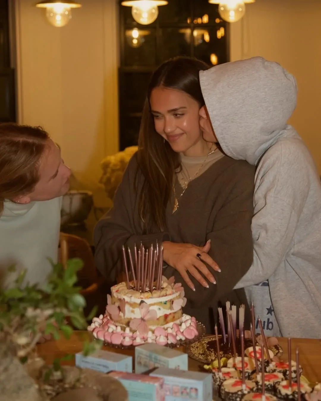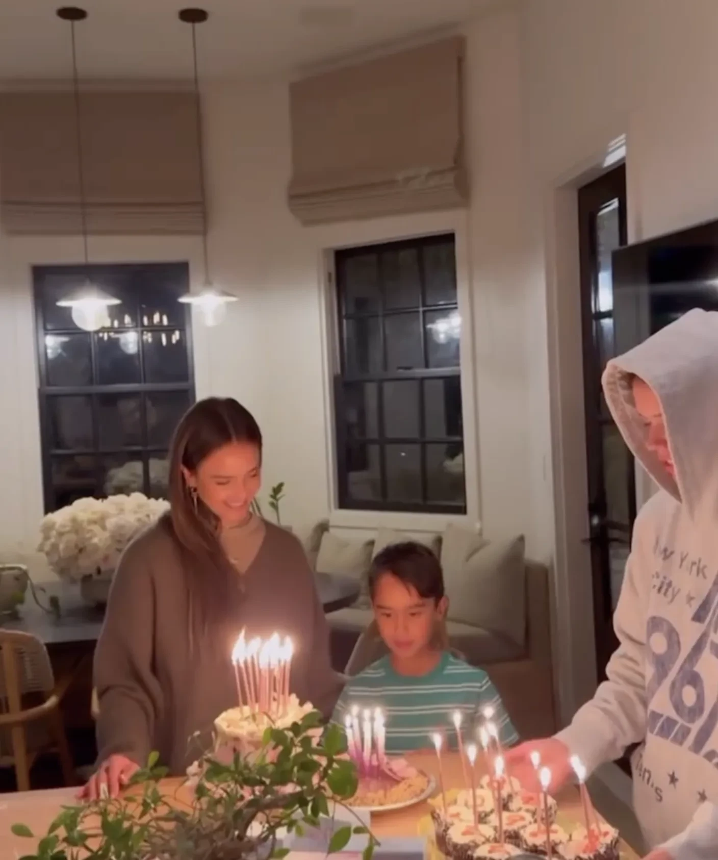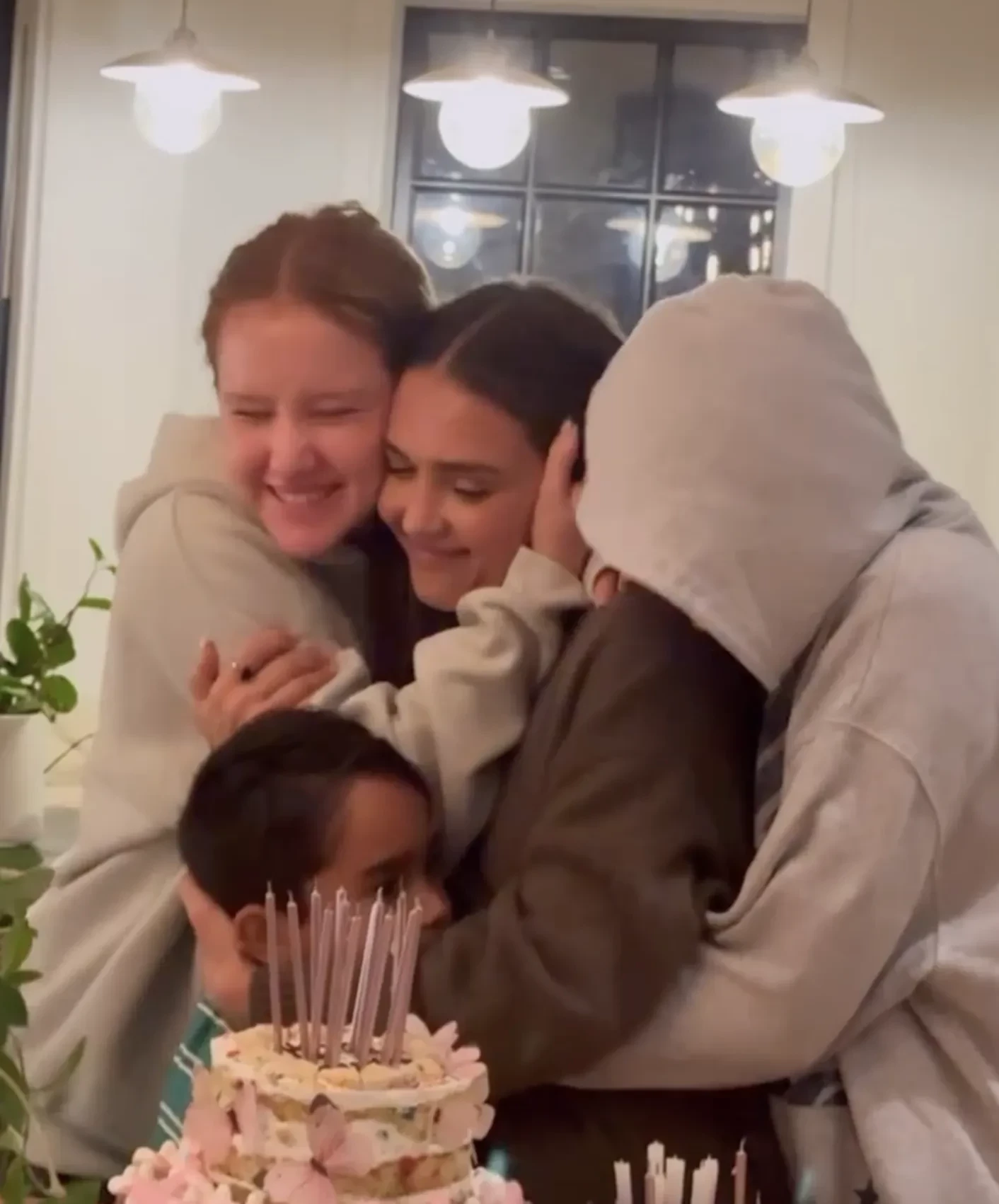 На кадрах именинница отмечает день рождения дома с двумя дочерьми, 16-летней Онор и 13-летней Хэвен, и семилетним сыном Хэйесом. Дети приготовили для Джессики каждый по торту и вынесли десерты по очереди вместе со зажжёнными свечами.