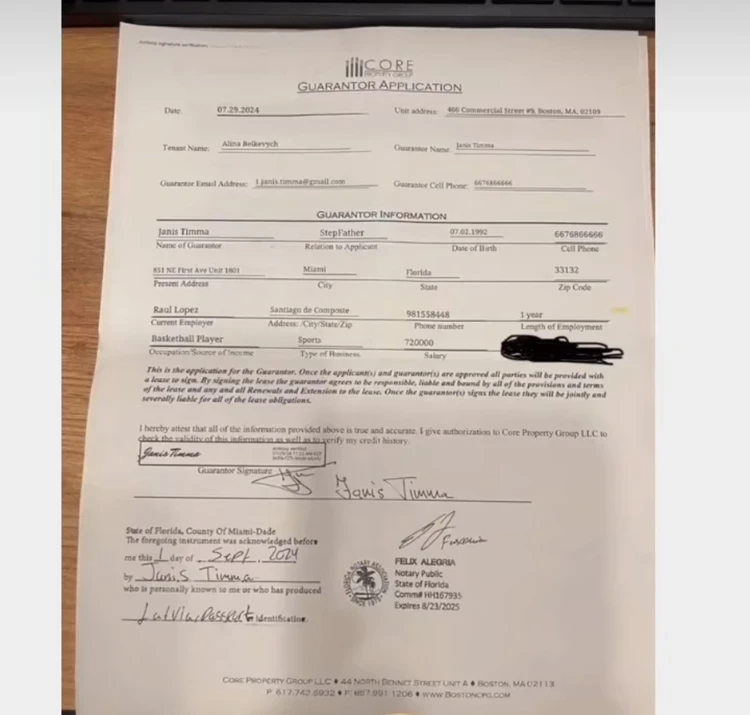 Кроме того, Райтису удалось раздобыть договор годовой аренды апартаментов в Америке для старшей дочери Анны Алины Белькевич, где поручителем и гарантом значился «stepfather Янис Тимма». В этом же документе указана и годовая зарплата Яниса, как баскетболиста, в размере 720 000 долларов (то есть почти по 5 млн рублей в месяц). Отец Яниса попросил обратить внимание на дату составления договора, а именно сентябрь 2024 года. Известно, что в то же время Анна Седокова подала на развод с баскетболистом после четырех лет брака. Райтис уверен, что его сына-«добряка» просто использовали.