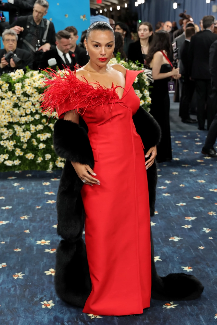 Лора Харриер в Gap Studio (Zac Pozen)Николь Кидман в BalenciagaНиколь Кидман в BalenciagaКендалл Дженнер в TorishejuBad Bunny в PradaАктриса Зои Салдана надела чёрно-белый образ Thom Browne, а Лана Дель Рей пришла не в компании мужа, как надеялись фанаты, а с другом, креативным директором Valentino Алессандро Микеле, и в платье его творчества с кружевом на спине и огромным пером. Ещё один гармоничный парный лук показали звёзды "Белого лотоса" Эми Лу Вуд и Патрик Шварценеггер. Блогерша Эмма Чемберлен позировала в стиле "офисной сирены" в Courreges, а Палома Эльсессер добавила красок этому вечеру в платье Ferragamo с перьями с меховой накидкой.