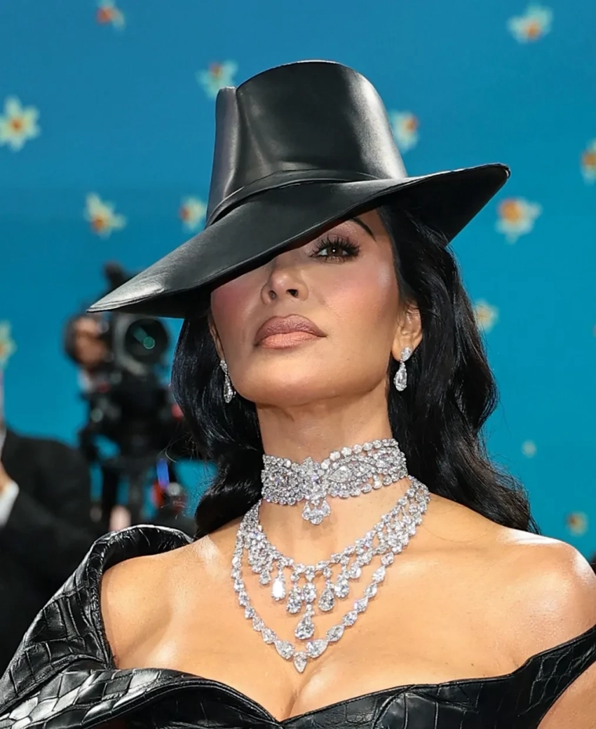 Ким Кардашьян в образе для Met Gala была больше похожа на "жену мафиози", чем на денди. Бизнесвумен и бывшая жена Канье Уэста позировала на дорожке в кожаном боди и юбке Chrome Hearts с цепями, в украшениях с бриллиантами и шляпе.