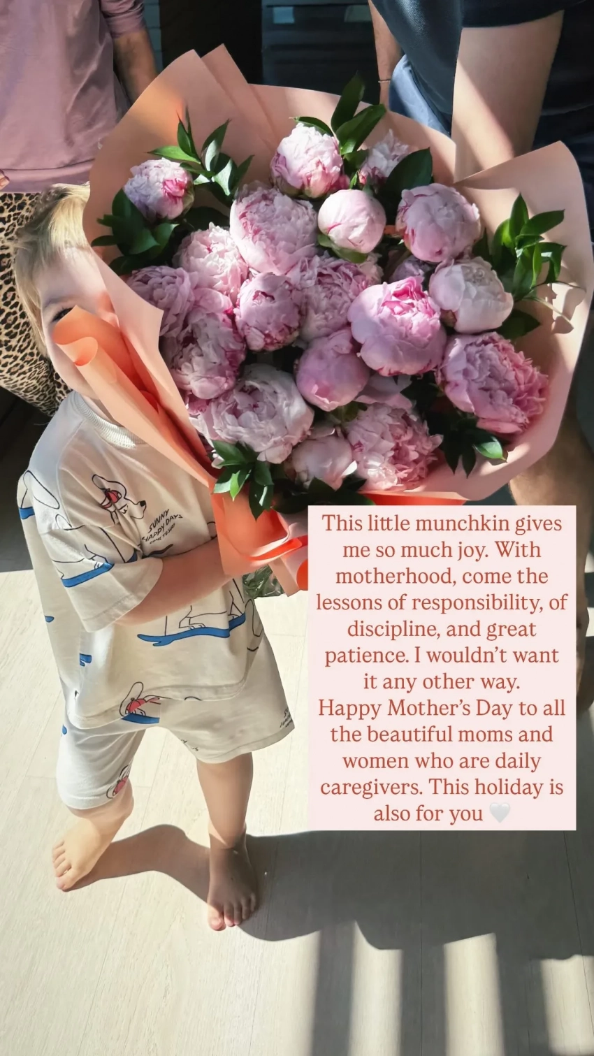 "Этот маленький манчкин (персонажи книги "Волшебник страны Оз" и порода кошек. — Прим. ред.) доставляет мне столько радости. Материнство учит нас ответственности, дисциплине и огромному терпению. Я бы не хотела, чтобы было по-другому. Поздравляю с Днём матери всех прекрасных мам и женщин, которые ежедневно заботятся о нас", — написала 38-летняя Шарапова под фото, на котором её сын держит букет цветов. Лицо мальчика она продолжает скрывать от публики.