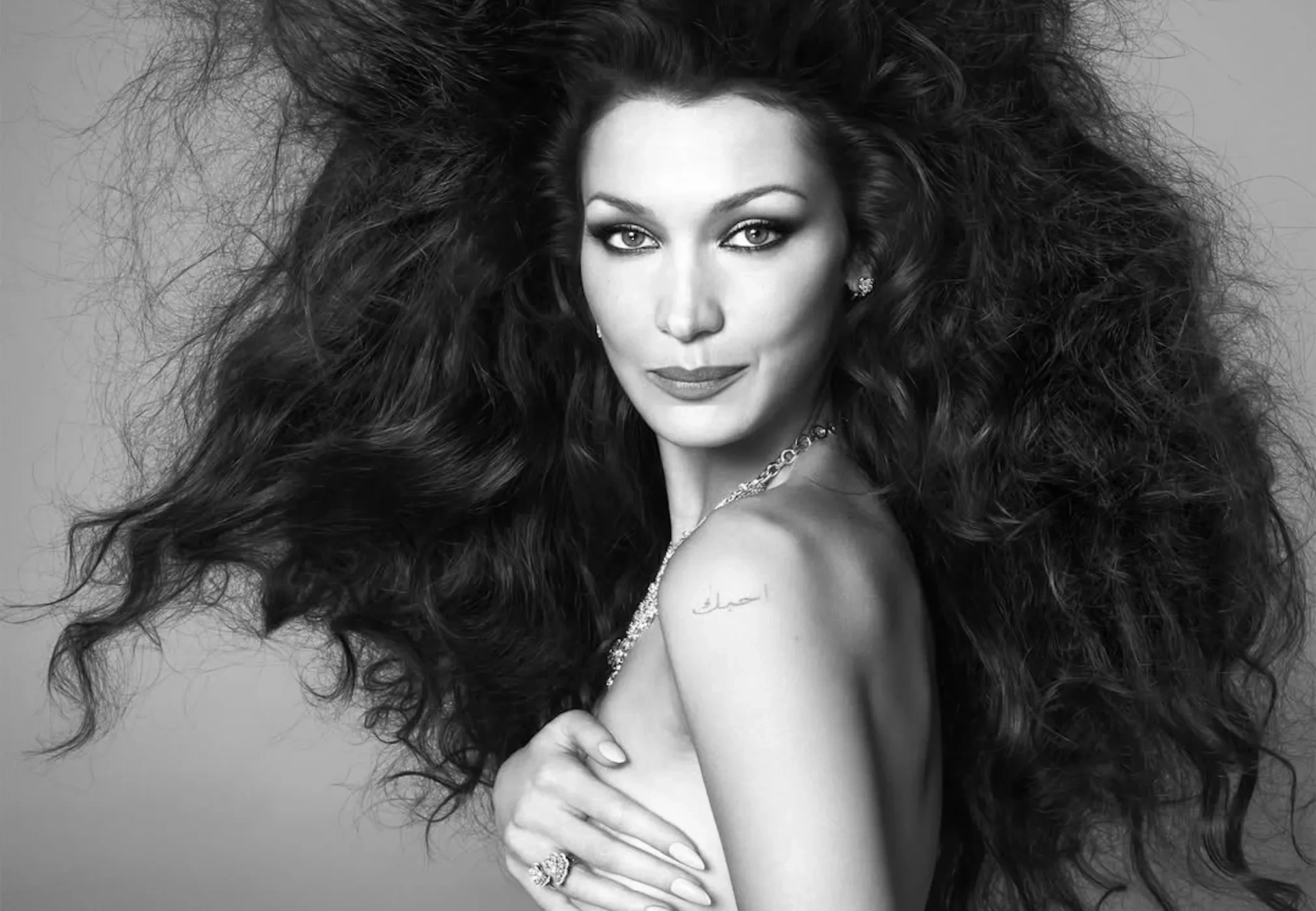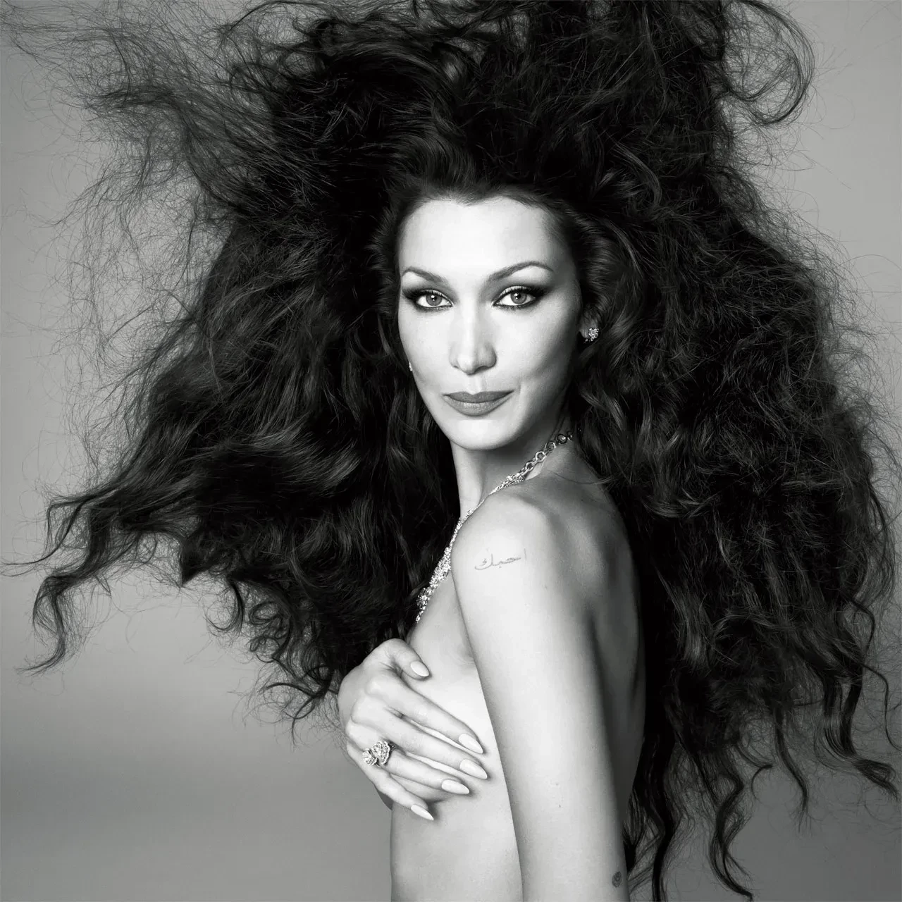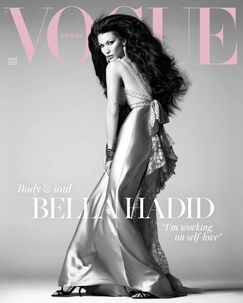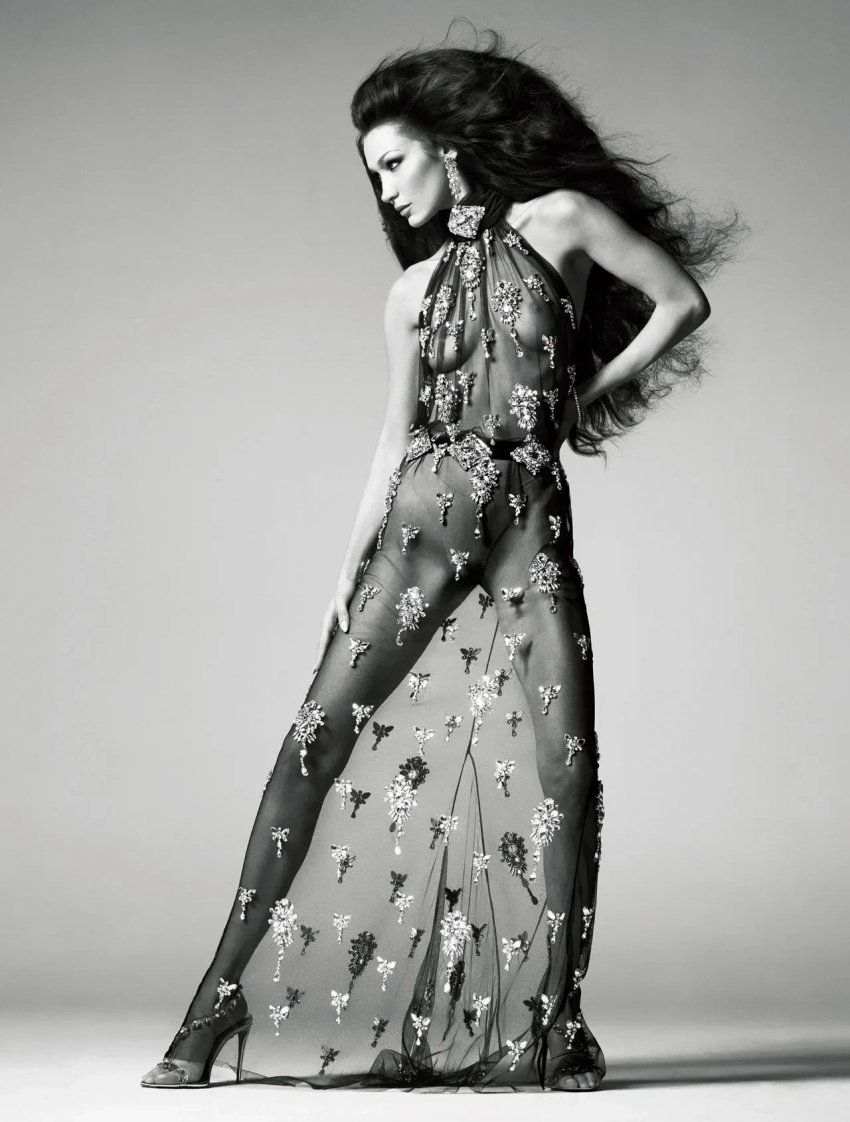 На обложке младшая сестра Джиджи Хадид позирует в Valentino, а на страницах издания — топлес, в прозрачном платье Dolce & Gabbana и "кольчуге" Chainmail.