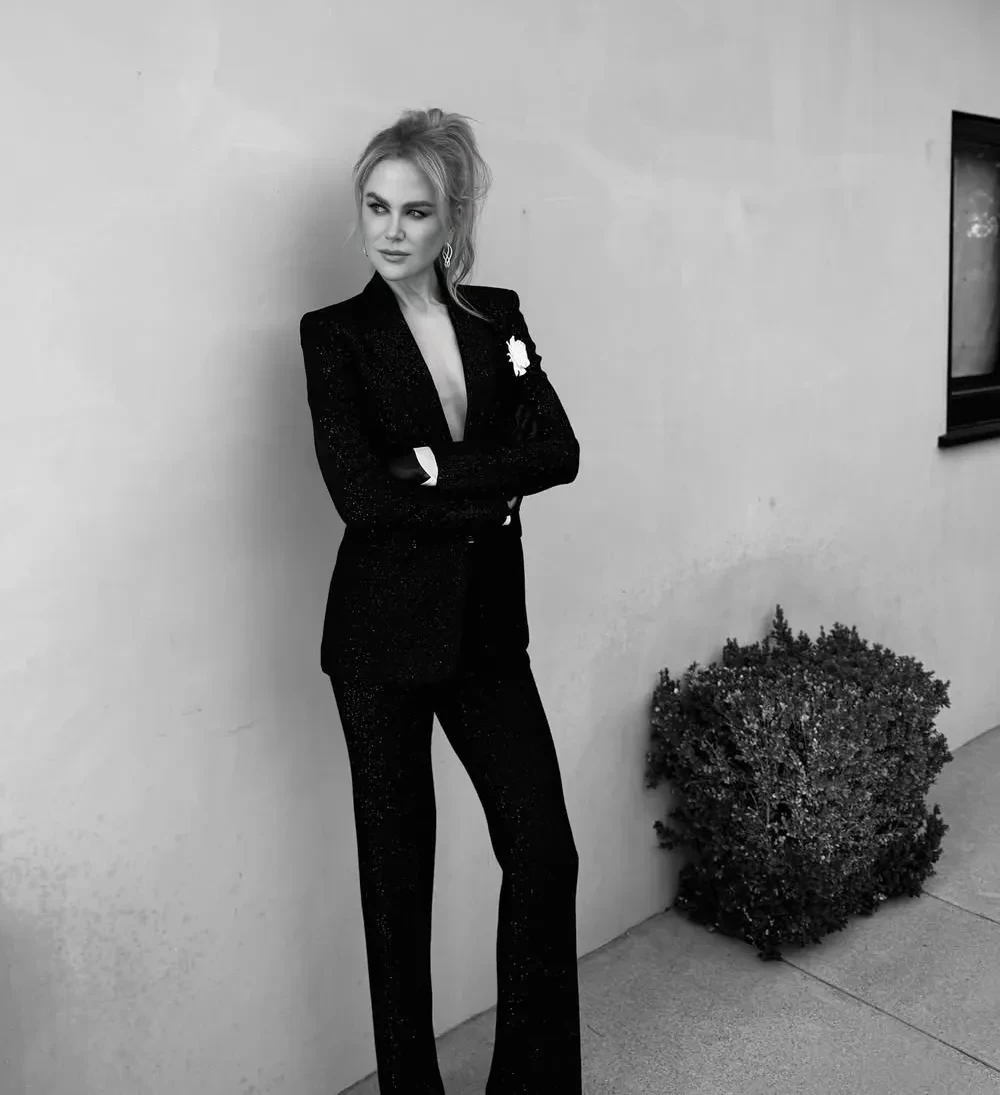 Николь Кидман посетила премьеру второго сезона сериала "Девять совсем незнакомых людей" в Беверли-Хиллз. На дорожку 57-летняя актриса вышла в чёрном жакете Tom Ford, надетом на голое тело, и брюках, дополнив образ перчатками в тон и причёской с высоким хвостом.