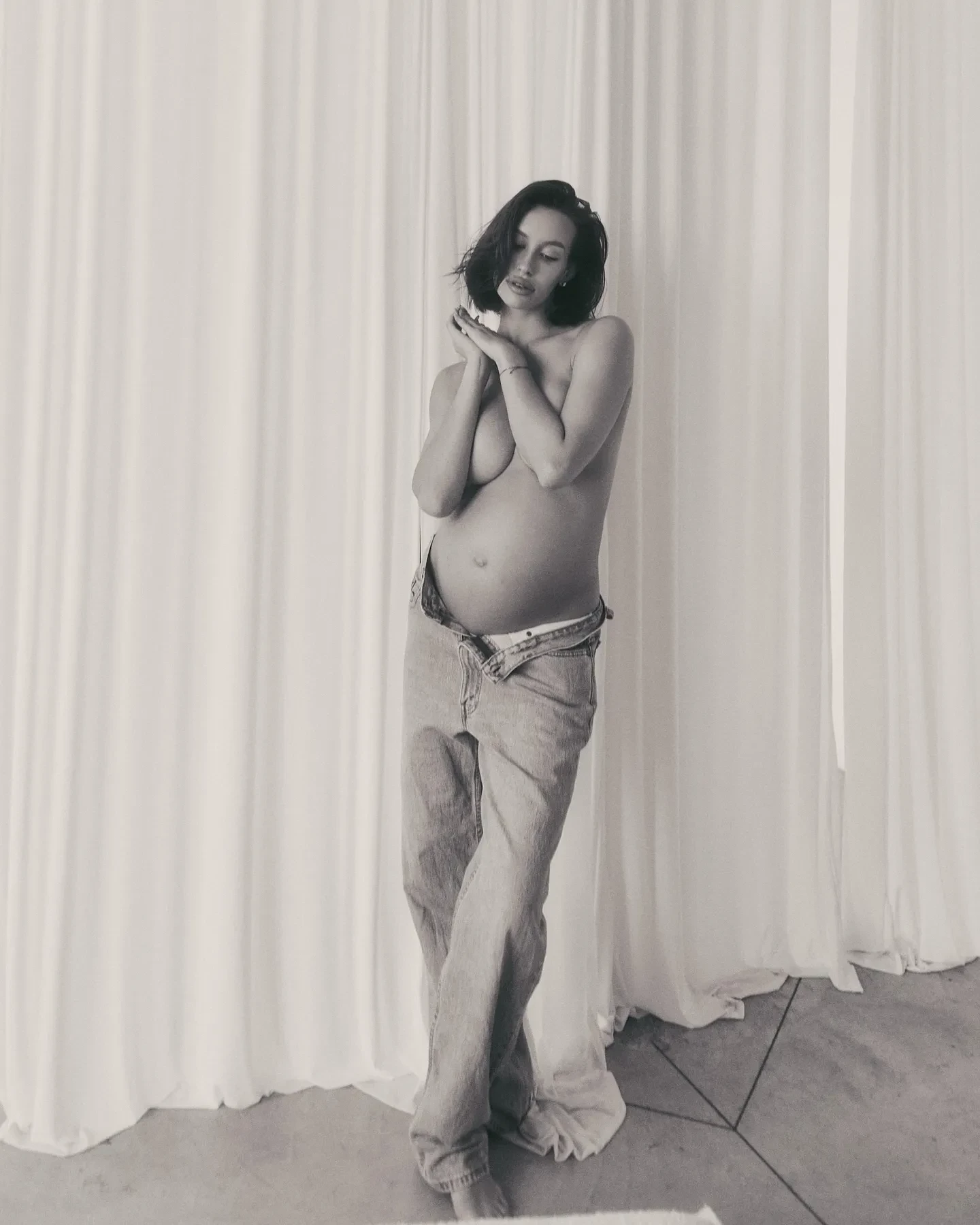 Валентина Иванова, которая ждёт ребёнка от Тимати, снялась в новой фотосессии. 31-летняя модель показала снимки, на которых предстала полуобнажённой. Из одежды на Ивановой оказались только расстёгнутые в области талии джинсы, а свою голую грудь она прикрыла руками.