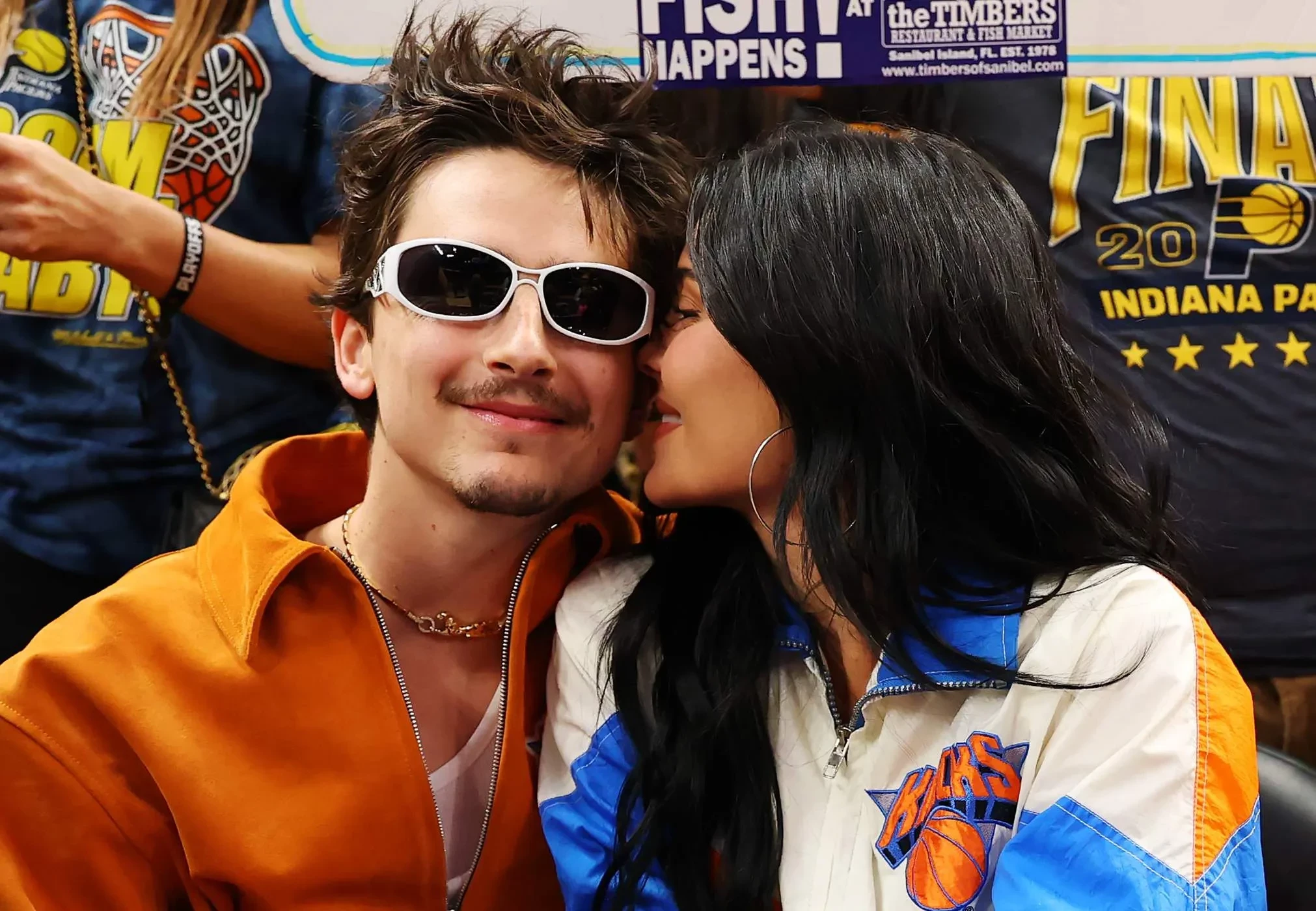 Компанию 29-летнему Тимоти составила его девушка, 27-летняя Кайли Дженнер. Влюблённые прошли на трибуны, держась за руки. На них обоих были куртки с эмблемой Knicks. Во время матча актёр и телезвезда бурно реагировали на происходящее на поле и не скрывались от направленных на них камер.