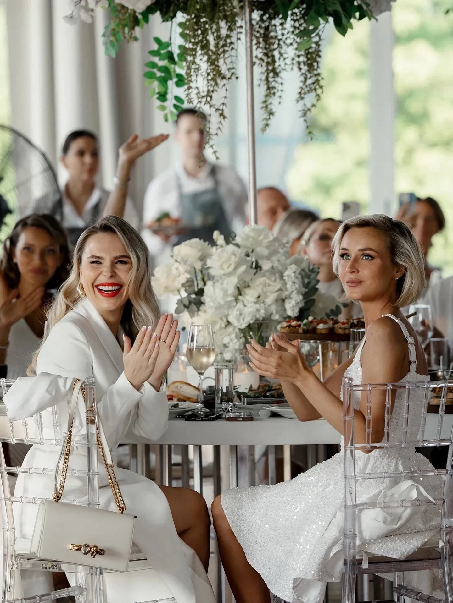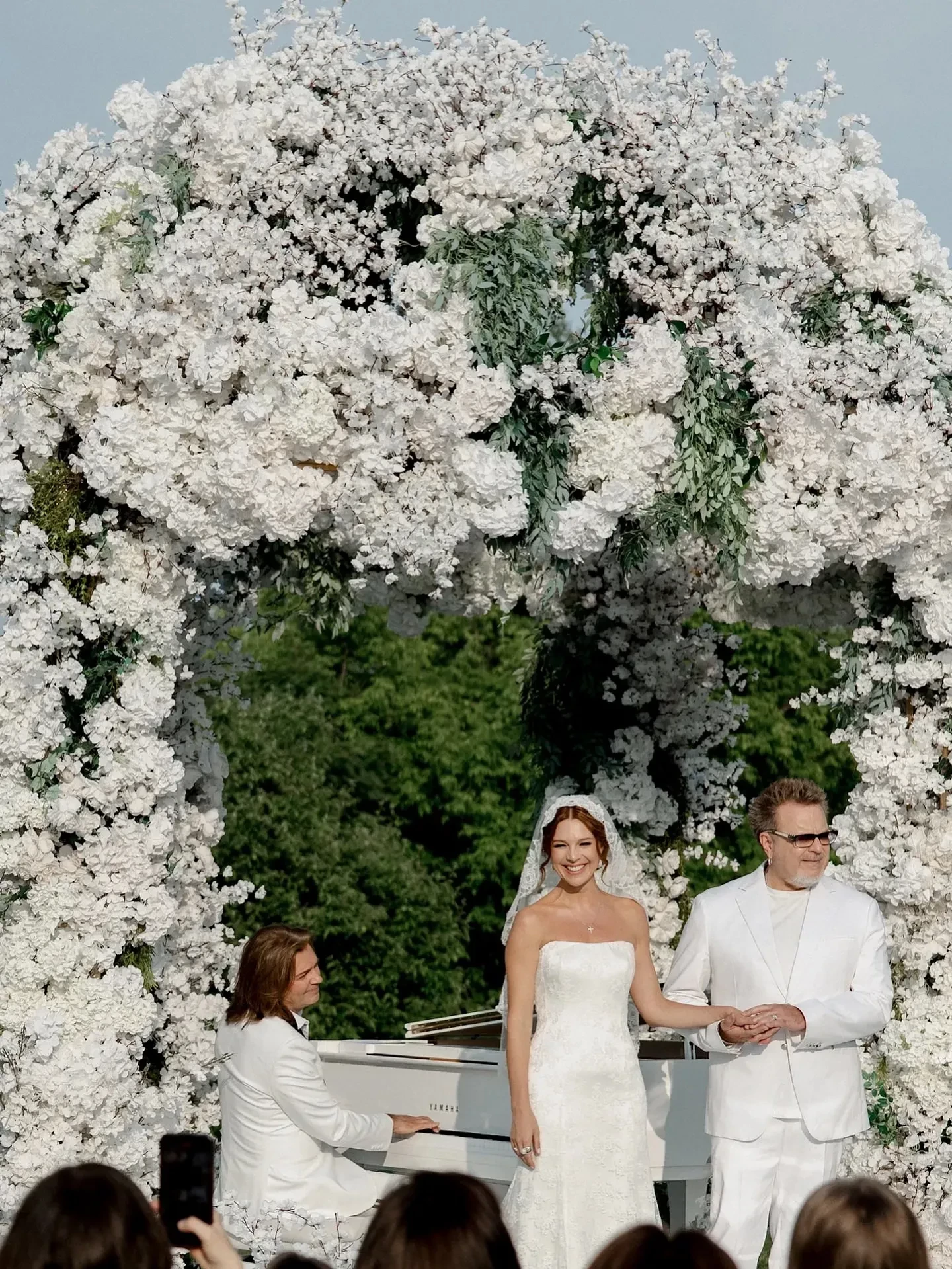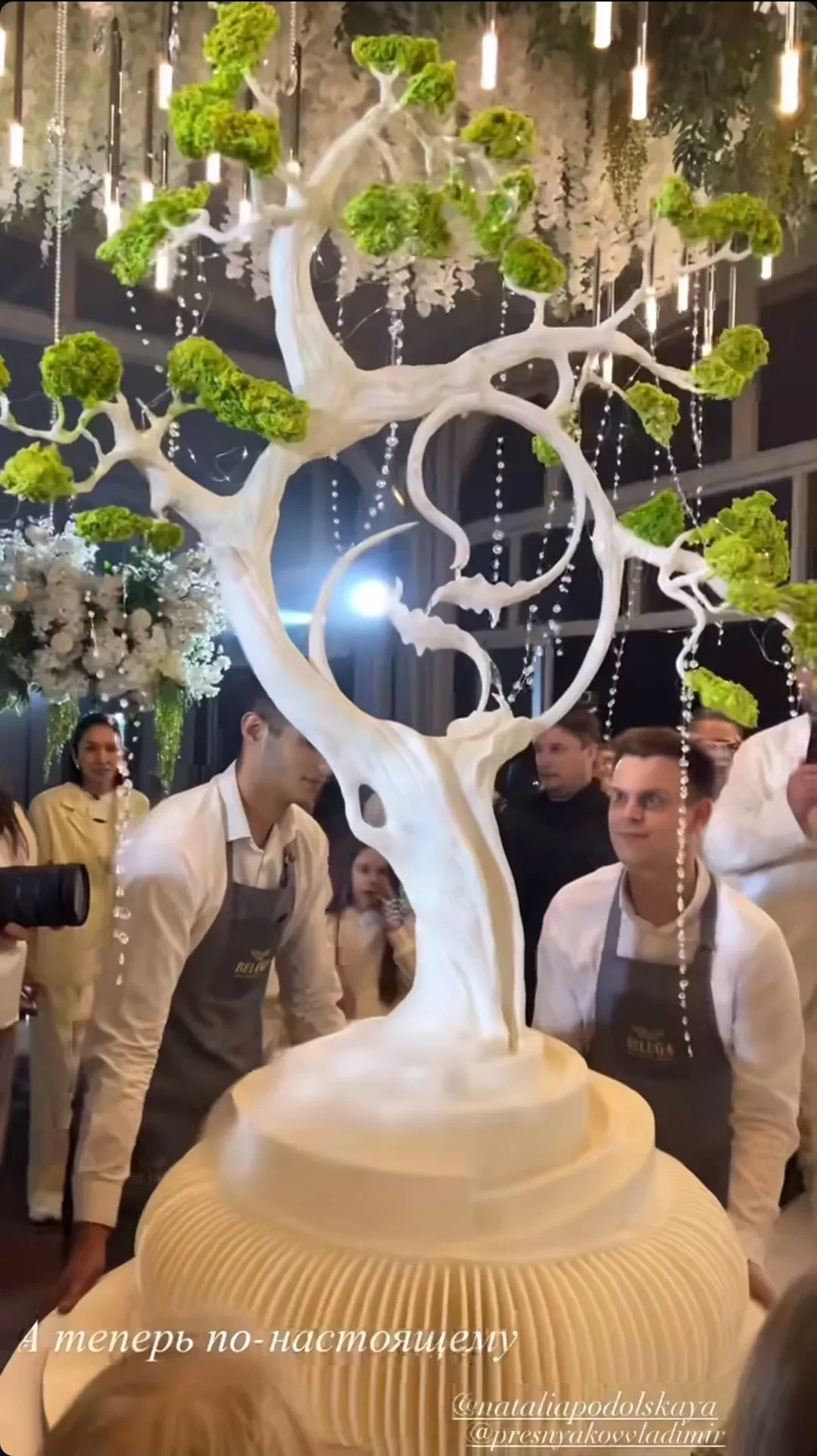 Наталья ПодольскаяДмитрий Маликов, Наталья Подольская и Владимир ПресняковПелагея и Полина ГагаринаПосле всех выступлений супруги предложили гостям свадебный торт. Однако сначала они разыграли всех: официант уронил торт, однако оказалось, что он был фейковым. После этого гостям представили настоящий торт в форме дерева.