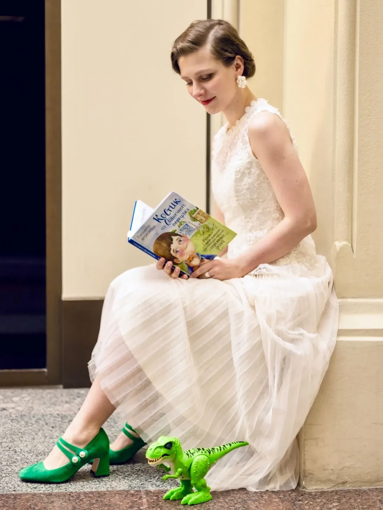 На фото 30-летняя актриса позирует в длинном белом платье с кружевным верхом и плиссированной юбкой. Образ дополняют зелёные туфли и игрушка-динозавр, которую, как рассказала сама Елизавета, вручил ей в качестве талисмана её трёхлетний сын Лев, рожденный от супруга Ильи Авербуха. "Он очень долго выбирал игрушку, которую хотел дать мне с собой в дорогу. Выбрал зелёного динозавра и наказал с ним не расставаться. Так мы с динозавриком в руках и с Лёвой в сердце и провели весь день", — объяснила она в подписи.