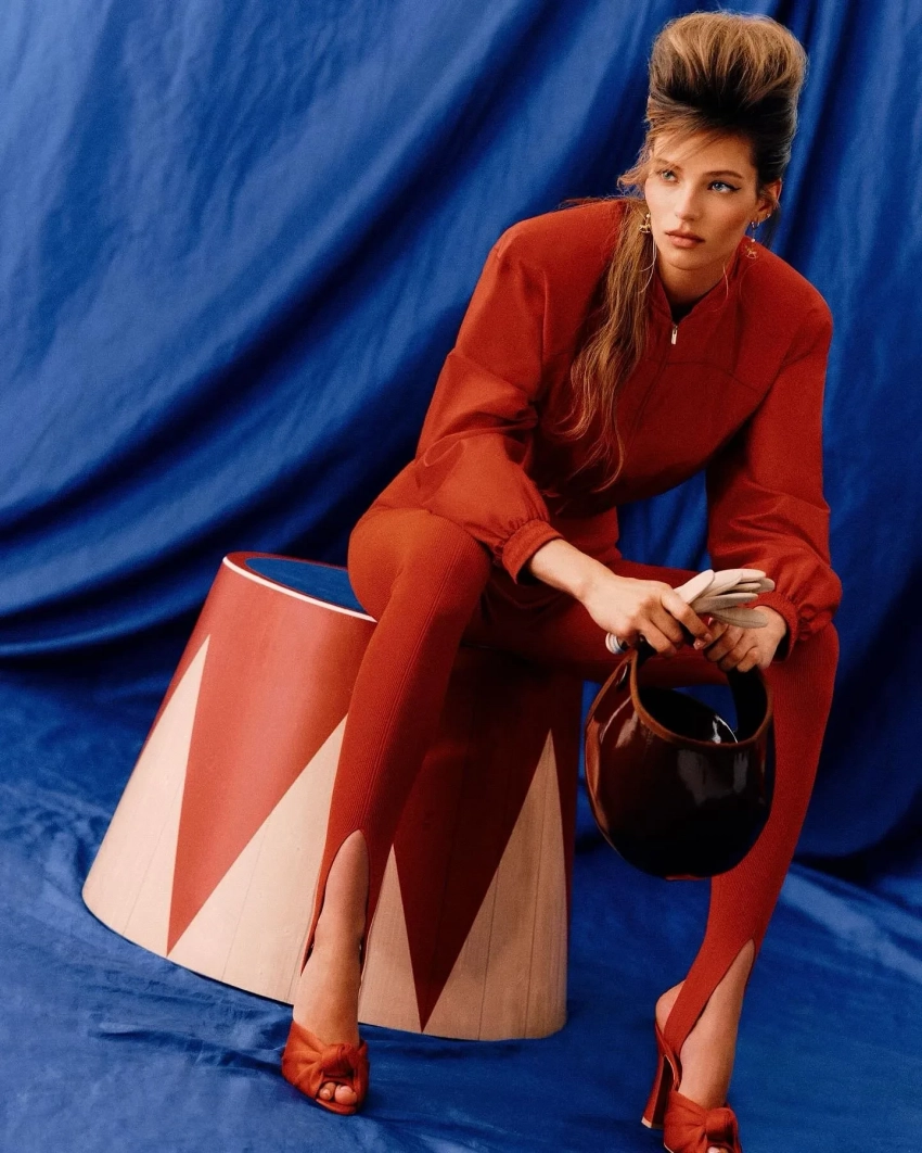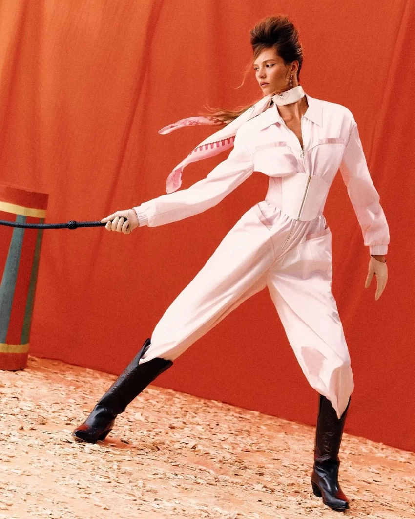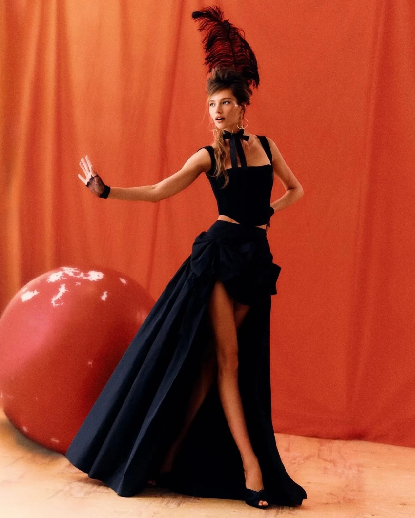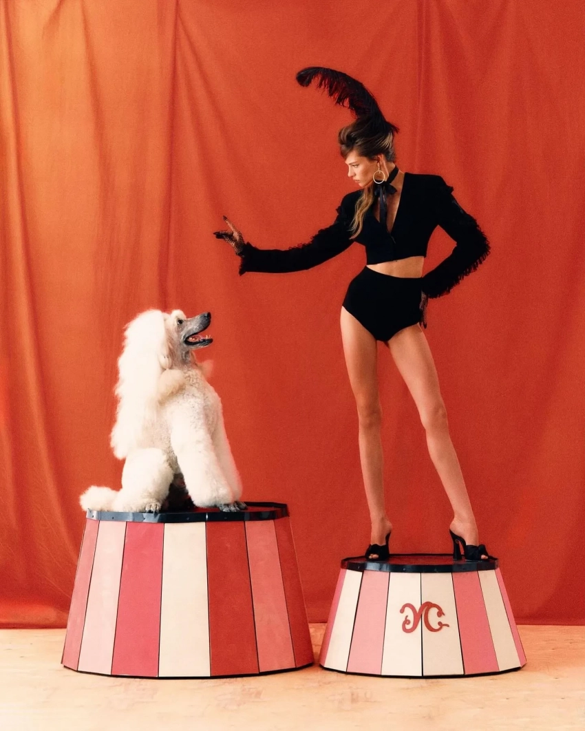 Алеся Кафельникова снялась в лукбуке новой круизной коллекции Ulyana Sergeenko. В объективе фотографа Нателлы Киселёвой 26-летняя модель предстала в образах, вдохновлённых эстетикой ретро-цирка и кабаре. В рамках съёмки она примерила красный и пудровый комбинезоны, кружевной комплект нежно-розового оттенка с юбкой с разрезом на бедре, корсетное мини-платье и другие наряды бренда.