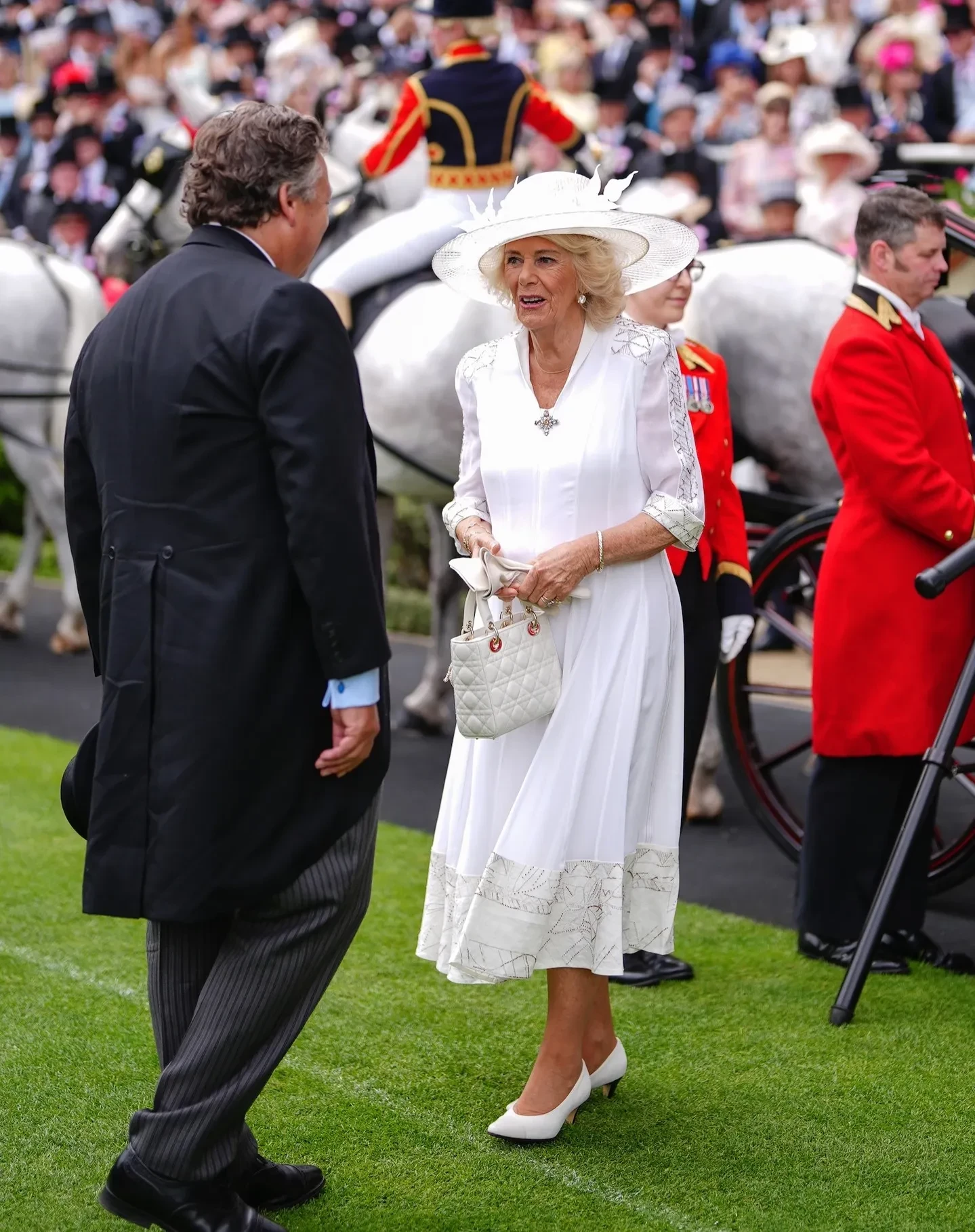 В четвёртый день ежегодных скачек Royal Ascot, которые проходят на ипподроме в Аскоте (Англия), королева Камилла блистала в белом платье британского дизайнера Анны Валентайн, дополнив образ брошью Raspberry Pip, принадлежавшей покойной королеве Елизавете II, и шляпой с перьями от Филипа Трейси. Однако внимание общественности привлёк только один аксессуар — сумка молочного цвета Lady Dior, которую Камилла держала в руках.