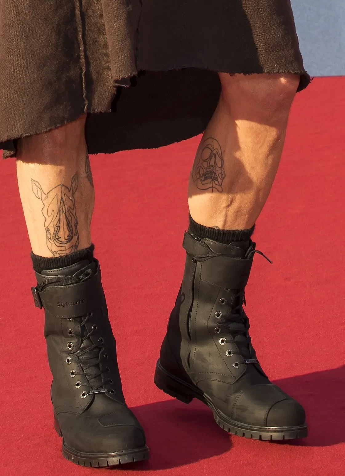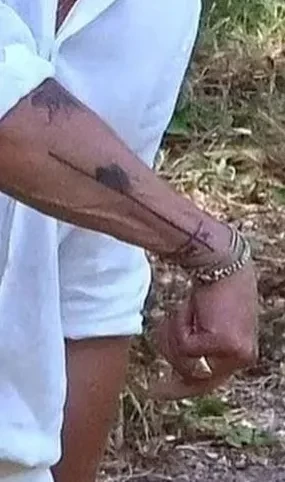 Татуировки Брэда Питта на ногахТатуировки Брэда Питта на ногахОдна из наиболее узнаваемых татуировок актёра — силуэт мумии Эци, нанесённый на внутреннюю сторону левого предплечья. Под изображением написано слово invictus (в переводе с латыни "непобедимый"), отсылающее к одноименному стихотворению Уильяма Эрнеста Хенли. Рядом находится фраза на французском языке Absurdités de l’existence ("абсурдности существования"). Наконец, на той же руке Брэда есть тату с изображением мотоцикла, там же располагается тонкая, почти незаметная линия.