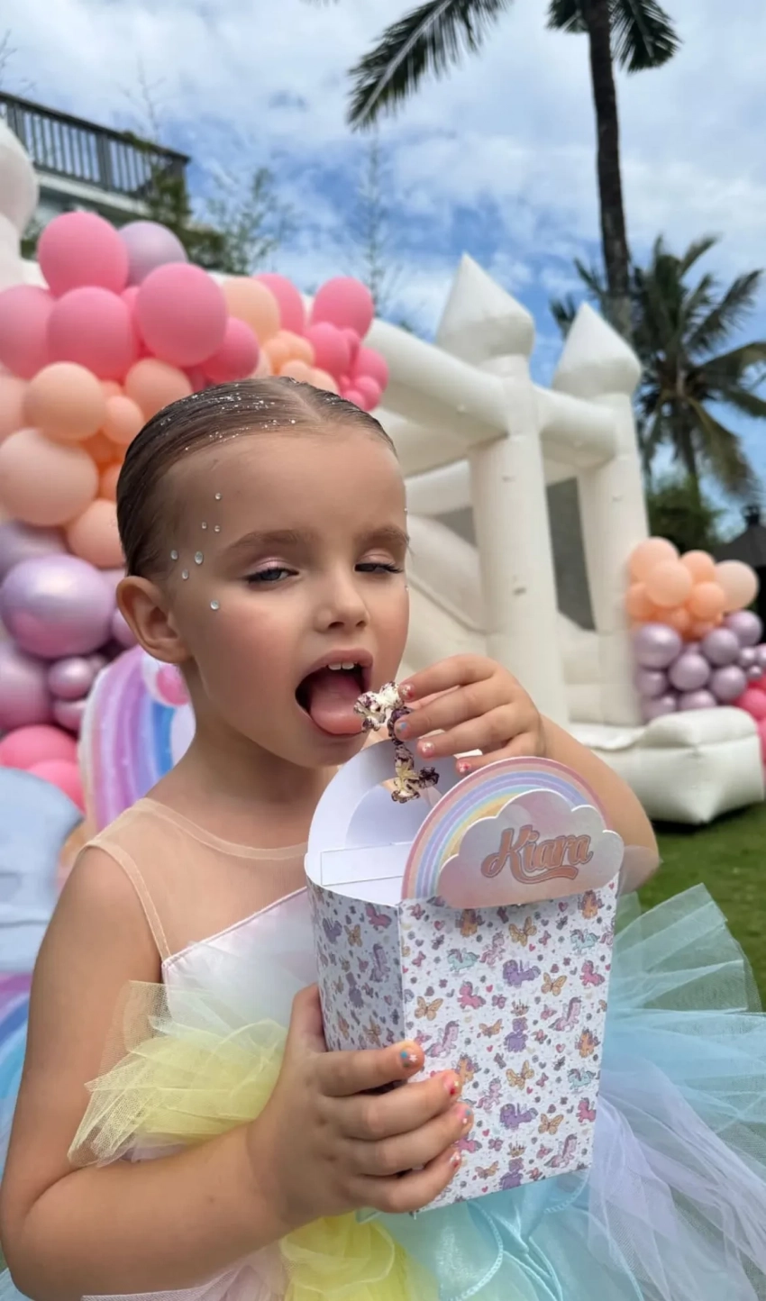 Кафельникова, которая недавно снялась в кампейне Vivienne Westwood, устроила для дочери вечеринку у бассейна. Территорию украсили надувной замок и множество воздушных шаров. Киара примерила на себя образ русалки и задула свечи на разноцветном торте с единорогом.