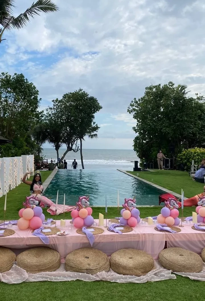 Алеся Кафельникова и Георгий Петришин с дочерьюАлеся Кафельникова и Георгий Петришин с дочерьюАлеся Кафельникова и Георгий Петришин с дочерьюДень рождения Киары прошёл на берегу океана, предположительно на Бали, где Кафельникова часто живёт с семьёй. Территорию у бассейна украсили надувной замок и воздушные шары. Детей и взрослых развлекали аниматоры-русалки, угощали разноцветным тортом, а вечером был фейерверк на пляже.