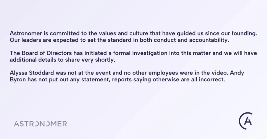 Компания Astronomer опубликовала официальное заявление в соцсети X после скандала с изменой их гендиректора Энди Байрона на концерте Coldplay. Представители пообещали начать внутреннее расследование, а также опровергли слухи о том, что предполагаемой любовницей является сотрудница компании Кристин Кабот.