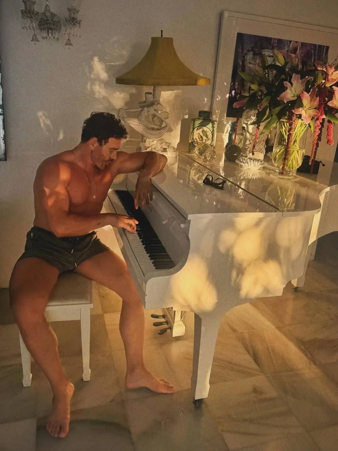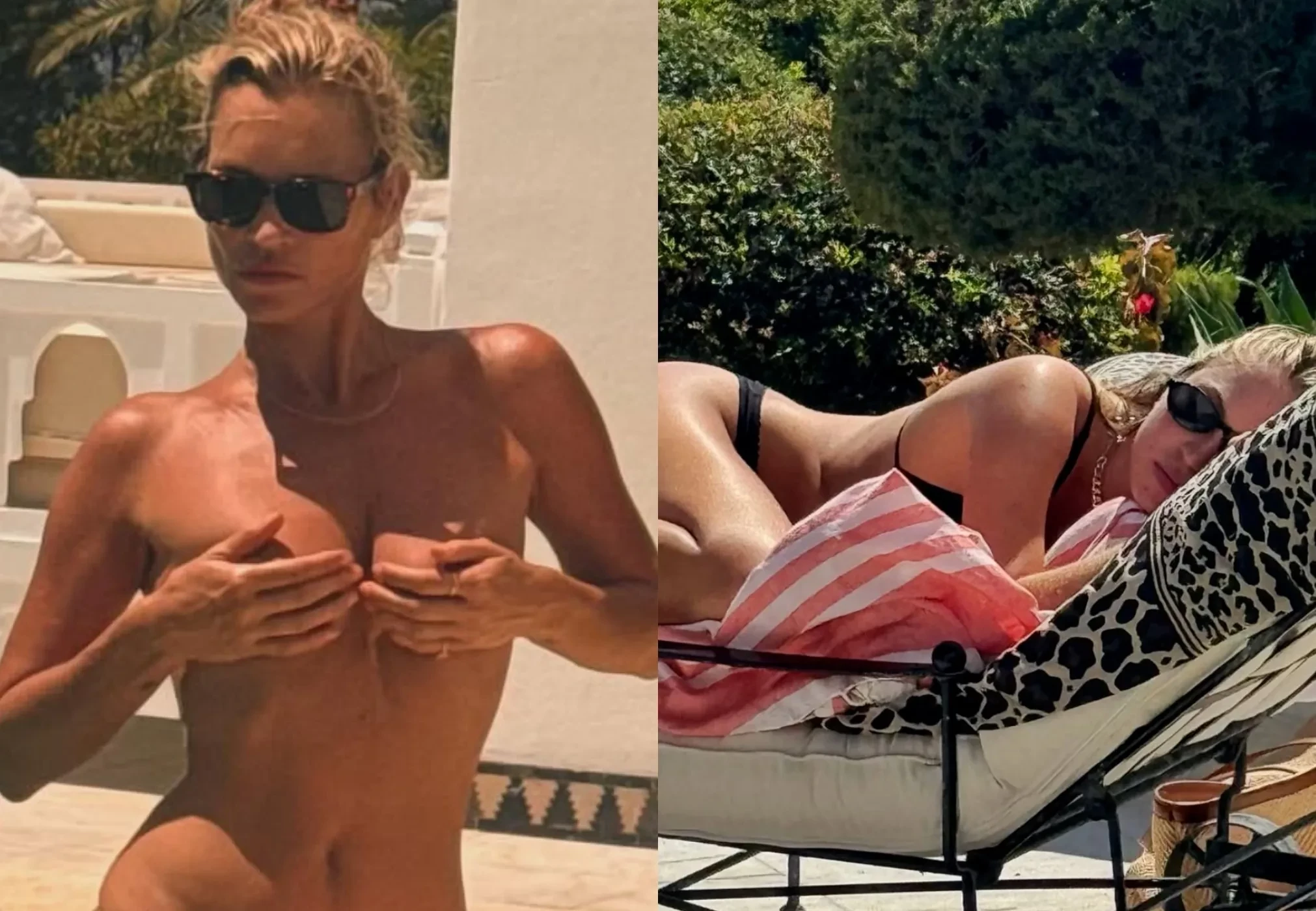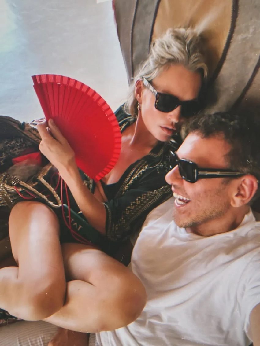 На фото супермодель позирует в бассейне в леопардовых плавках, прикрывая грудь руками, а Лила тем временем отдыхает на шезлонге. Пару дней назад Мерт выложил ещё несколько фото с Кейт: на них они делают совместное селфи и модель загорает без верха.