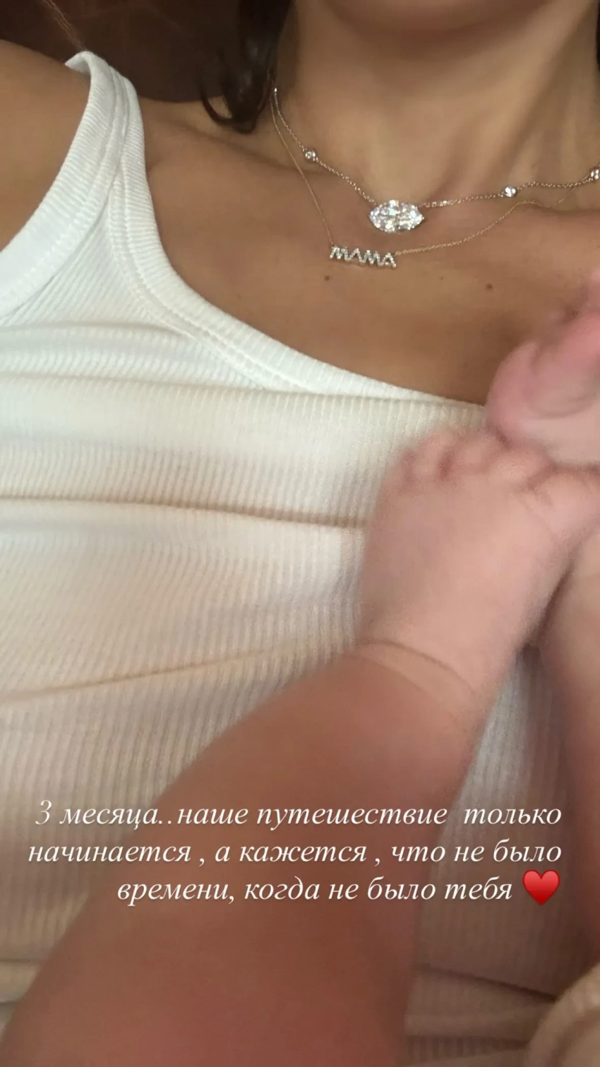 На снимке запечатлены ножки Марка, который лежит на груди у своей матери. Кроме того, на Оболенцевой можно заметить подвеску с камнями с надписью "мама". "3 месяца... Наше путешествие только начинается, а кажется, что не было времени, когда не было тебя", — обратилась к сыну Надежда.