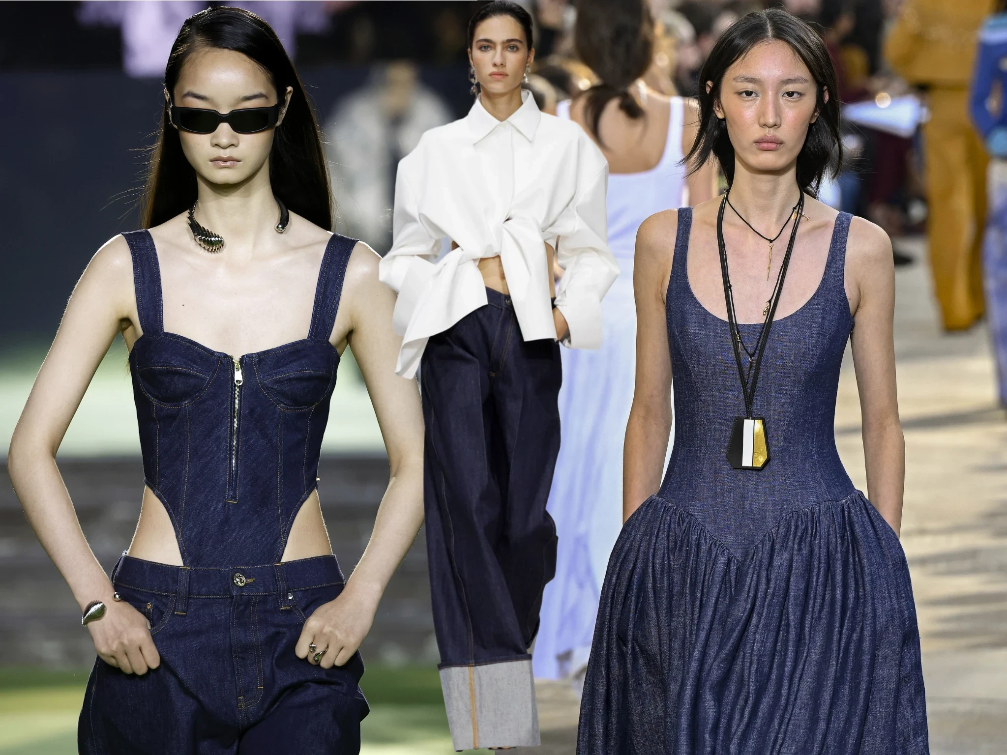Синий необработанный деним возвращается на вершину трендов. Casablanca предлагает корсетные топы, Gabriela Hearst — пышные платья, а Dior и Celine пересматривают классические джинсы. В уличной моде лидируют куртки и брюки Flared и Bootcut, слегка расклешенные книзу, визуально удлиняющие ноги.
