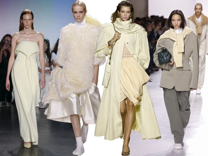 Кремово-желтый, Popcorn Yellow и Vanilla Yellow — самые востребованные оттенки сезона, особенно в свитерах, маечках и полупрозрачных летних платьях. Фиолетовые оттенки — пурпурные, сливовые, лавандовые и баклажановые — гармонично сочетаются с кремовым, лаймовым и нежно-розовым, а также используются в аксессуарах и нейтральных образах.