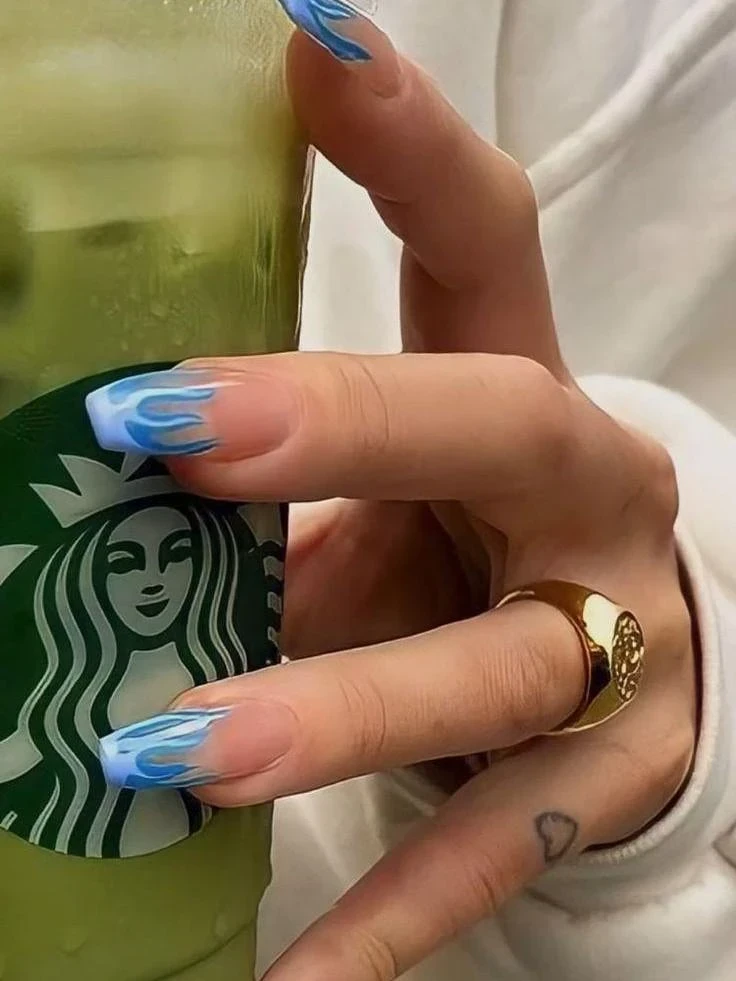 Синий маникюр с огненными линиями подойдет тем, кто планирует год поэтапно, стремится к стабильному прогрессу и хочет видеть результаты своих действий.