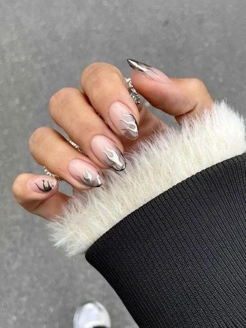Серебряное пламя добавляет ногтям рельеф, отражает свет и подчеркивает готовность рассматривать новые возможности.