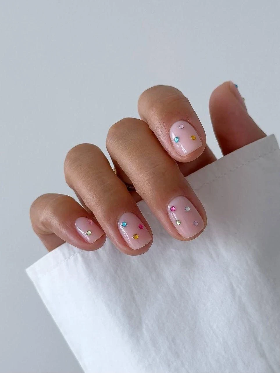 Лучше всего такие детали смотрятся на спокойных базовых оттенках: молочном, серо-бежевом, нежно-розовом. Можно выделить один-два ногтя или добавить по одному стразу на каждый палец. Короткая длина делает сияние аккуратным и уместным как в повседневной жизни, так и на вечерних мероприятиях.