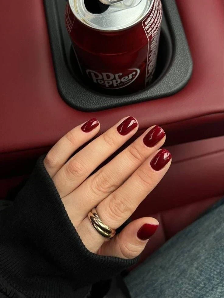 Бордовый оттенок на коротких ногтях смотрится уравновешенно и благородно. Он сохраняет насыщенность, но не утяжеляет образ благодаря небольшой длине.
