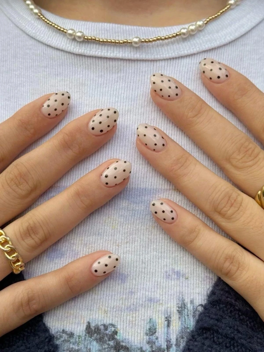 Маникюр с рисунком в горошек на коротких ногтях выглядит аккуратно и сдержанно. Небольшие точки создают ритм, но не перетягивают внимание на себя.