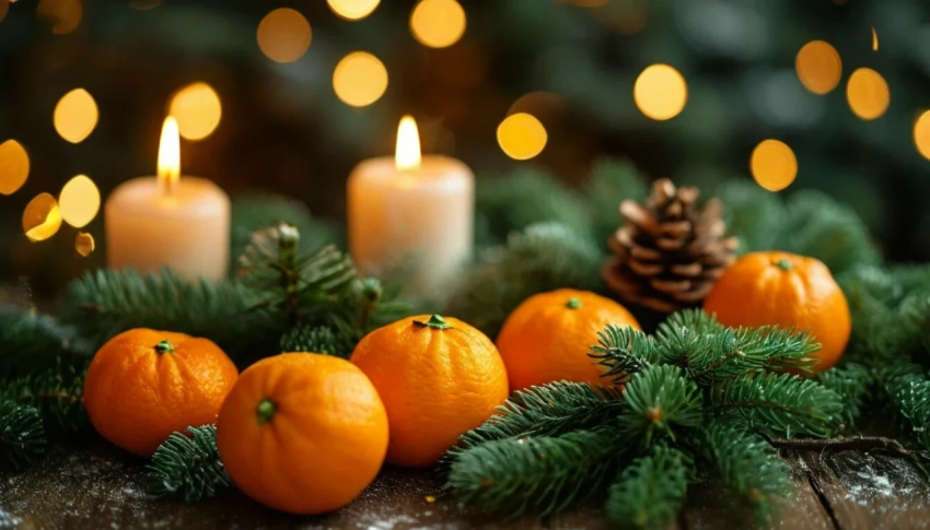 • Декор: хвойные композиции, шишки, свечи, мандарины.