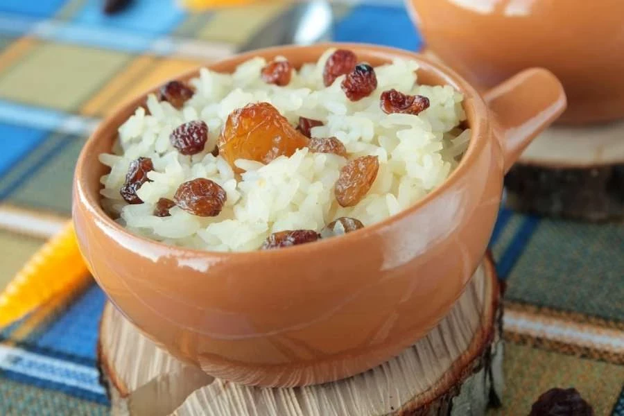 - Завтрак: рисовая каша с изюмом, бананом и мёдом