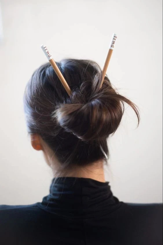 - низкий пучок с палочкой — строго и элегантно.