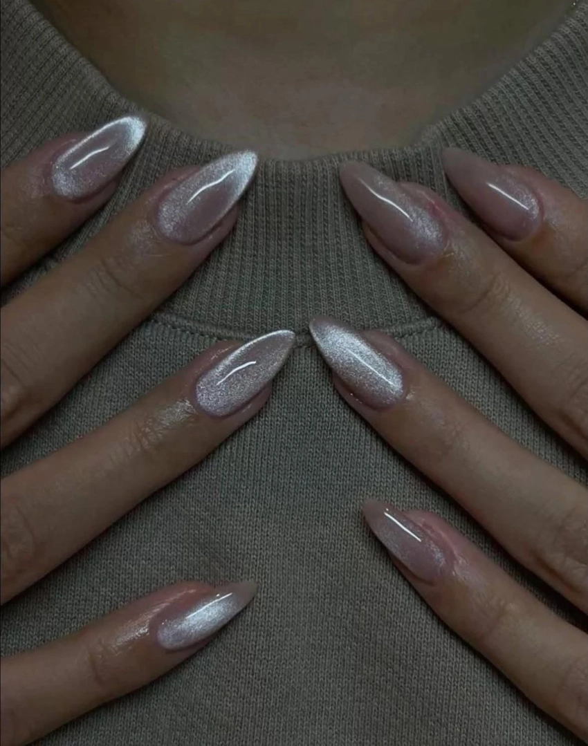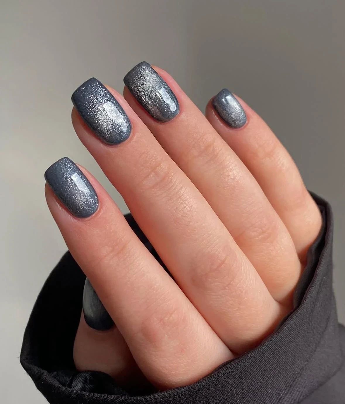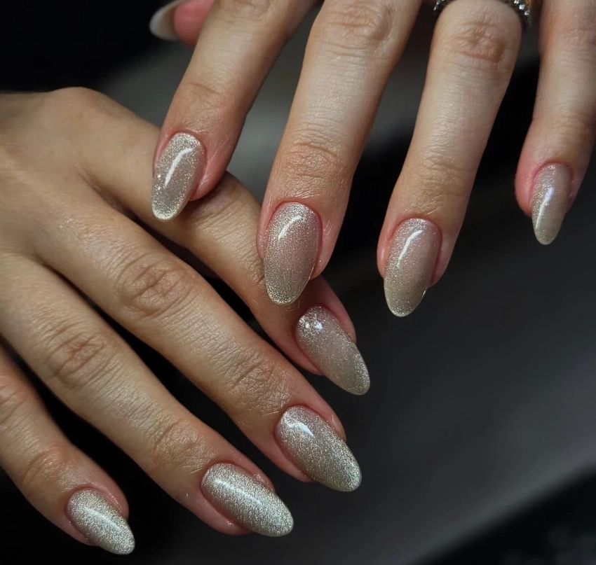 Глиттерные покрытия наносятся в несколько слоев для плотного покрытия и легкого объема. Матовый финиш делает цвет более спокойным и сдержанным — идеально для офиса или повседневного образа.