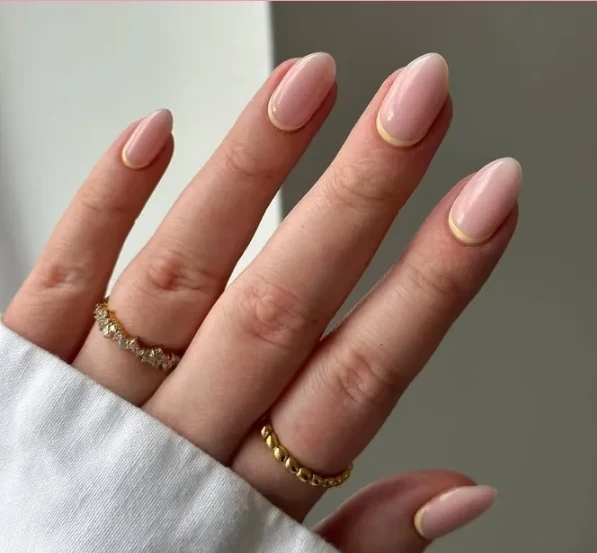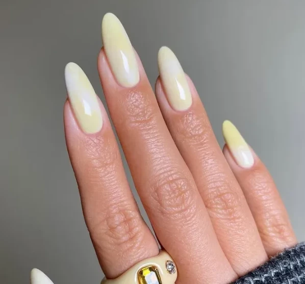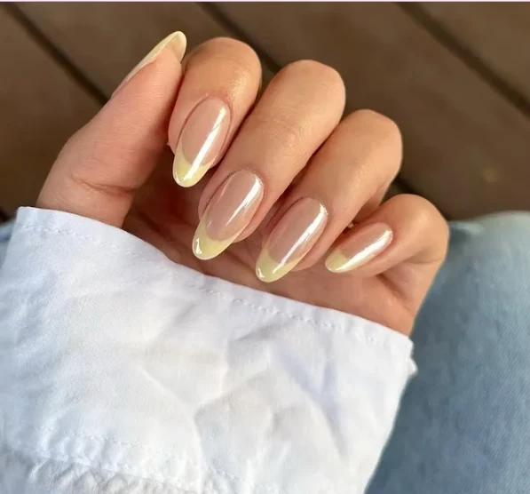 Простой, но эффектный вариант, вдохновленный знаменитым маникюром Хейли Бибер. Глянцевое покрытие с легким хромированным эффектом напоминает пончик в лимонной глазури. Такой маникюр будет особенно уместен в весенне-летний сезон, добавляя ногтям сияния и нежности.