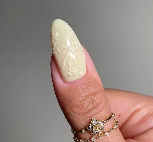 Тренд на объемные украшения в маникюре продолжает набирать популярность. Попробуй добавить небольшие 3D-банты, выполненные в тон основному покрытию. Они сделают дизайн более выразительным и подчеркнут твою креативность. Этот вариант подойдет для тех, кто любит необычные детали и не боится экспериментов.