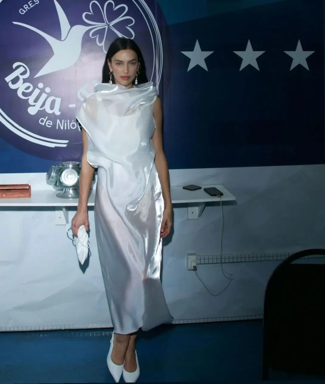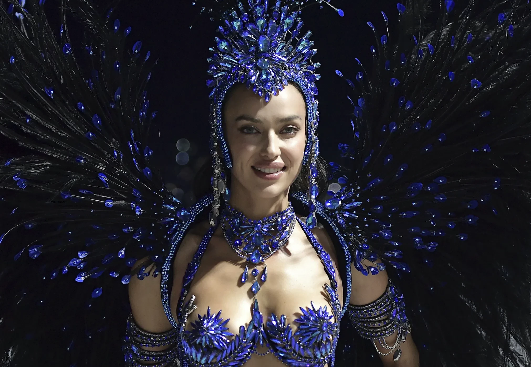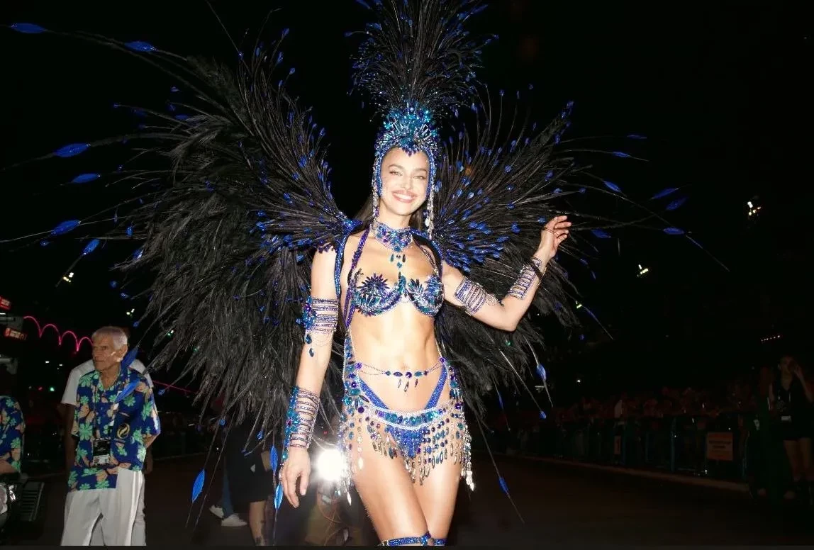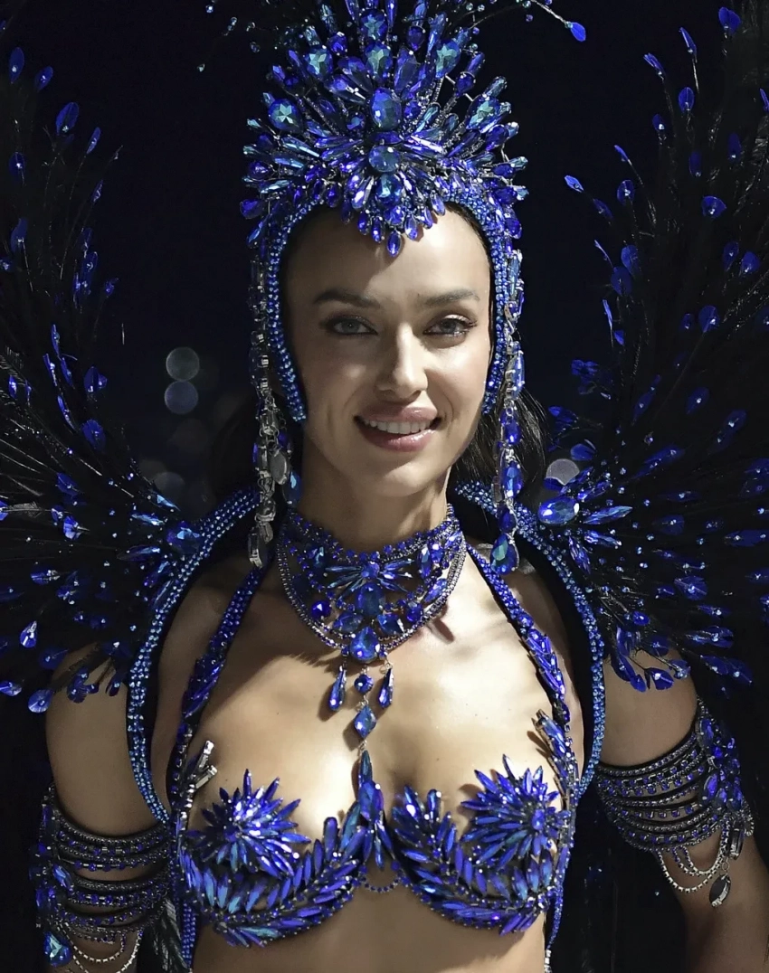 Перед карнавалом Ирина Шейк подогрела внимание подписчиков к мероприятию, опубликовав фото в обнажённом виде и в украшениях синего цвета. Прошлой ночью Ирина прошлась по улицам бразильского города в блестящем бикини этого же цвета и головном уборе с перьями.