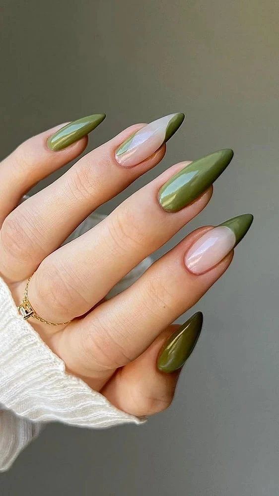Зеленый в моде, но не кислотный, а утонченный: оливковый, хаки, изумрудный. Сочетай его с нюдовой базой, делай акценты на двух ногтях или замени белый в френче на зеленый.